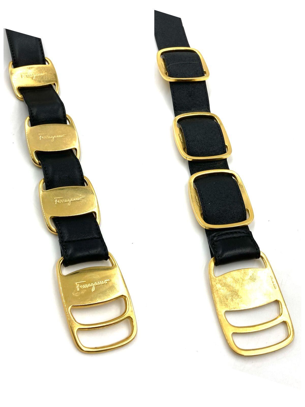 Salvatore Ferragamo サルヴァトーレフェラガモ ヴァラリボン レザーベルト ヴァラチェーン風 ブラック×ゴールド イタリア製 全長83cm レディース