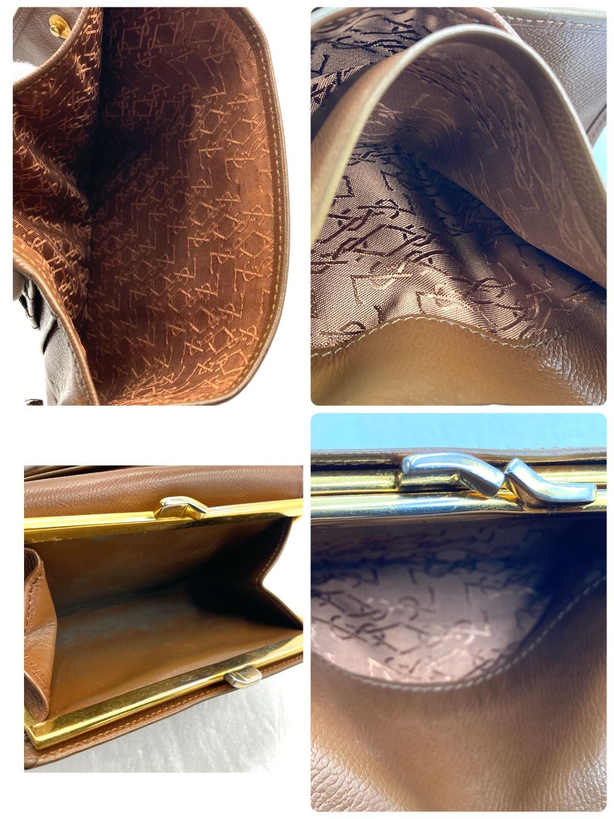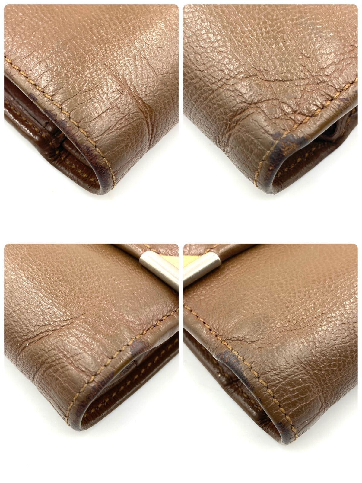 Yves saint Laurent イヴサンローラン YSL型押し 三つ折り財布 三角プレート レザー 本革 ブラウン ゴールド金具 がま口 レディース