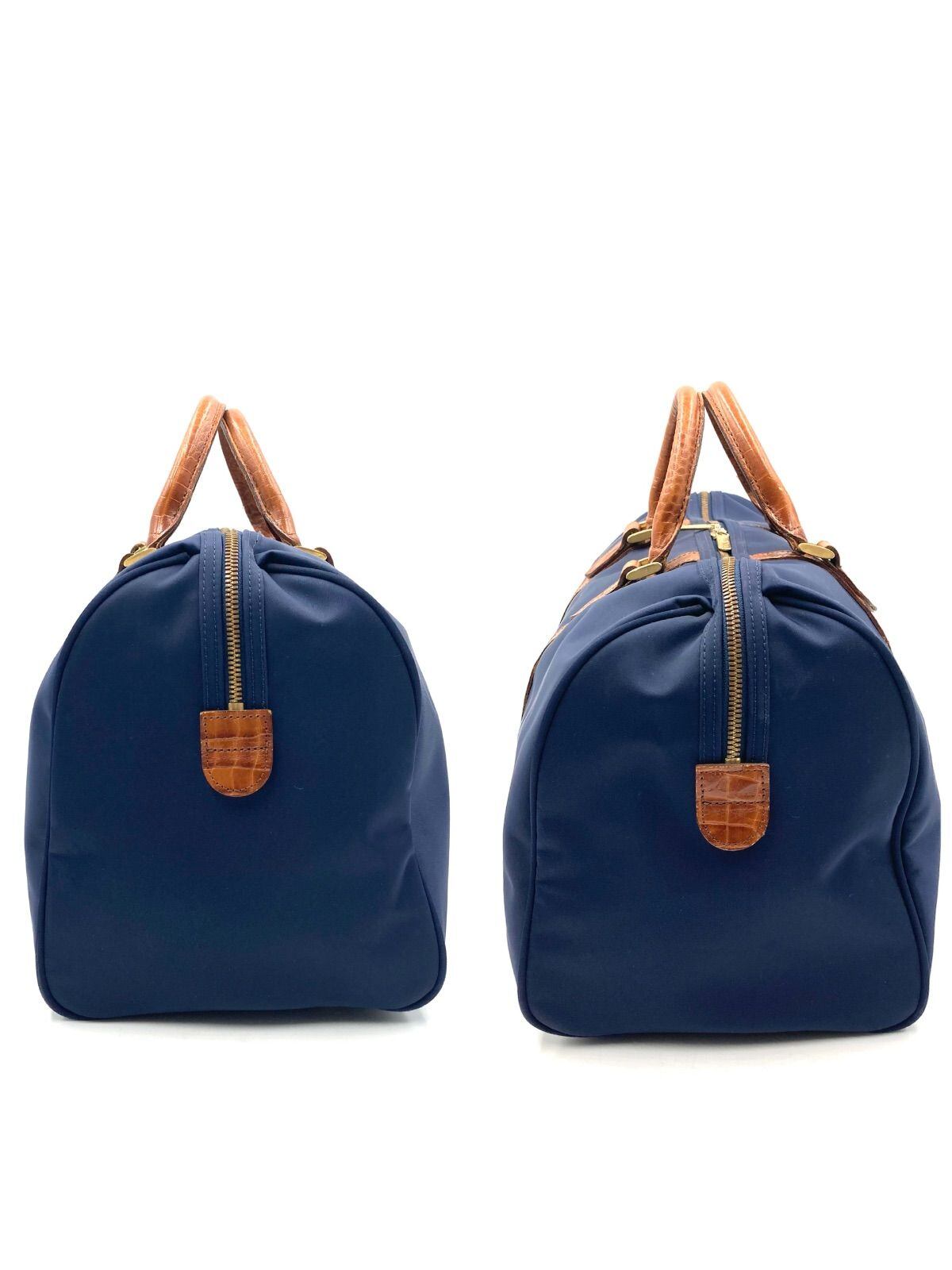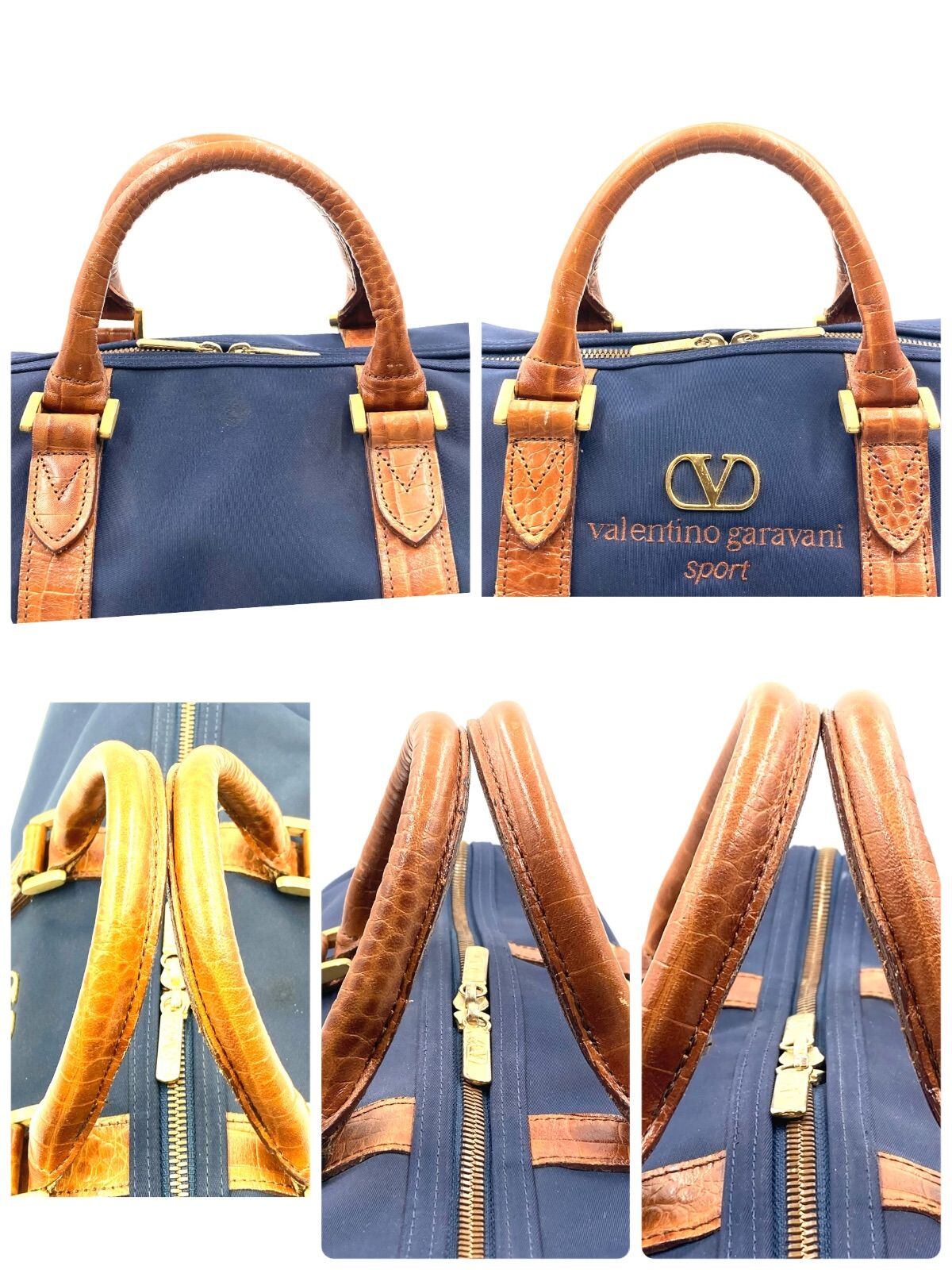 ■美品■VALENTINO GARAVANI SPORT ヴァレンティノガラヴァーニスポーツ ボストンバッグ ナイロンキャンバス×クロコ型押しレザー ブルー系ネイビー×ブラウン ゴールド金具 ロゴ 底鋲