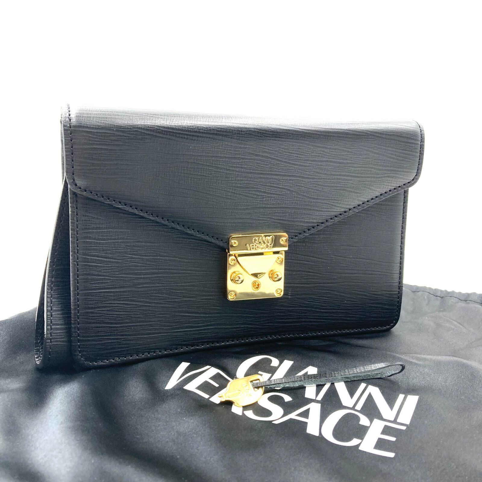 ■極上美品■GIANNI VERSACE ジャンニヴェルサーチ セカンドバッグ クラッチバッグ 鍵ホック ロゴ金具 オールレザー 本革 ブラック ゴールド金具 鍵付き メンズ 袋あり
