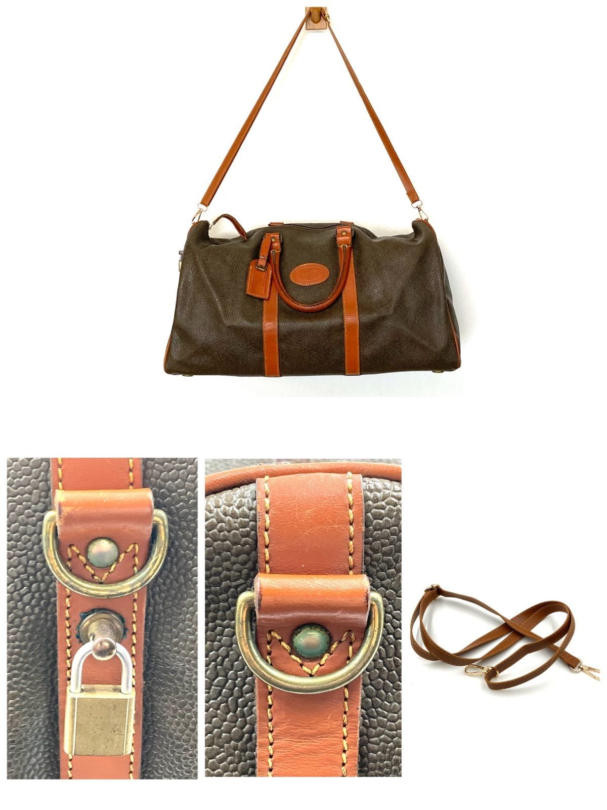 ■良品■Mulberry マルベリー 2way 大型ボストンバッグ 旅行カバン レザー ロゴプレート グレーカーキ×ブラウン 内側チェック総柄 ゴールド金具 南京錠、鍵付き イタリア製