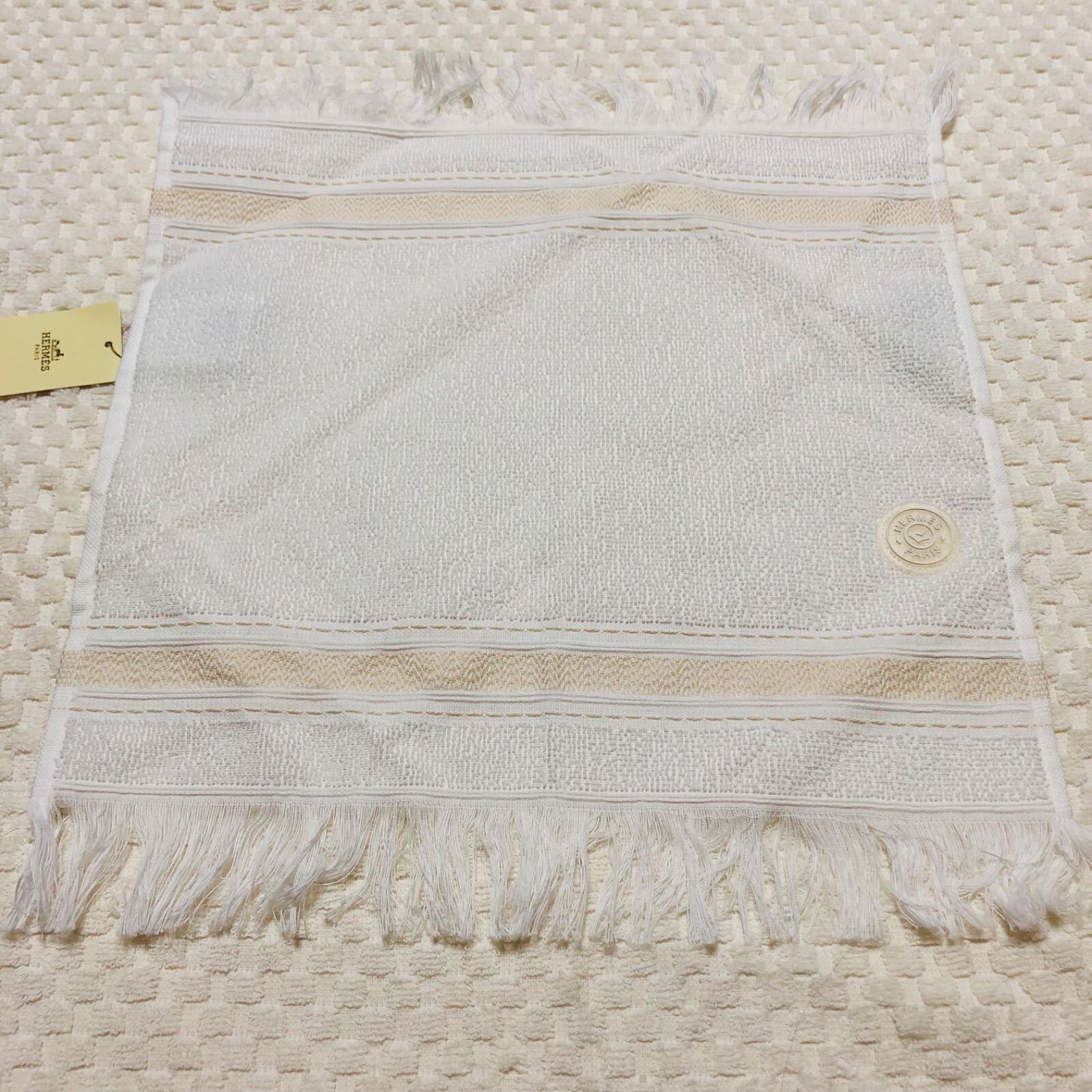 ■未使用タグ付き■HERMES エルメス CARRE CABINE HERMARIN EPONGE カレ フリンジハンドタオル ロゴサークル コットン100% ベルギー製 ホワイト系アイボリー 箱付き
