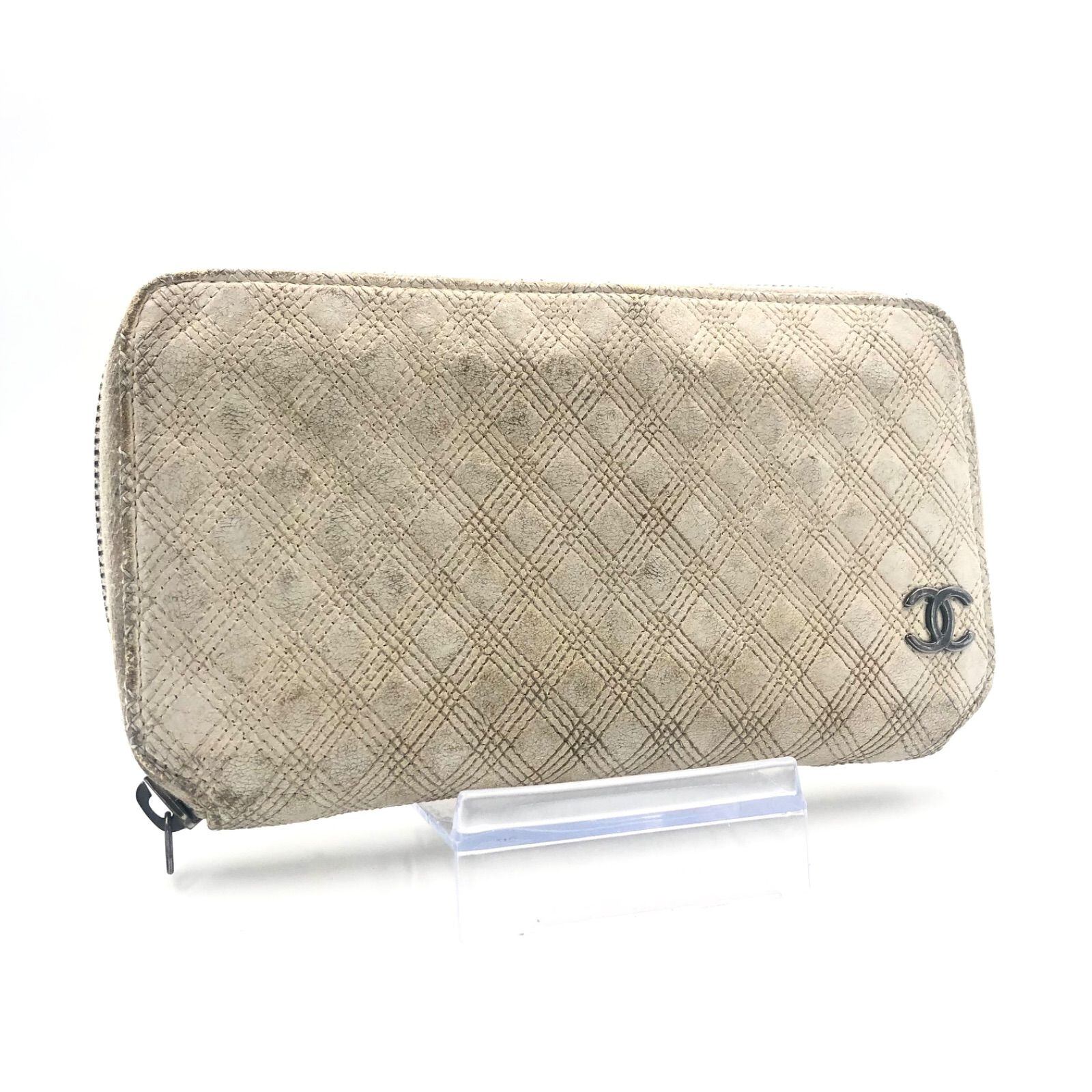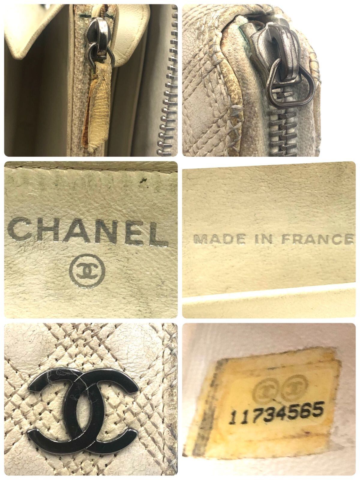 ■希少■CHANEL シャネル ココマーク トリプルステッチ ラウンドファスナー 長財布 レザー 本革 ホワイトベージュ系 シルバー金具 フランス製 シリアルシールあり 11番代
