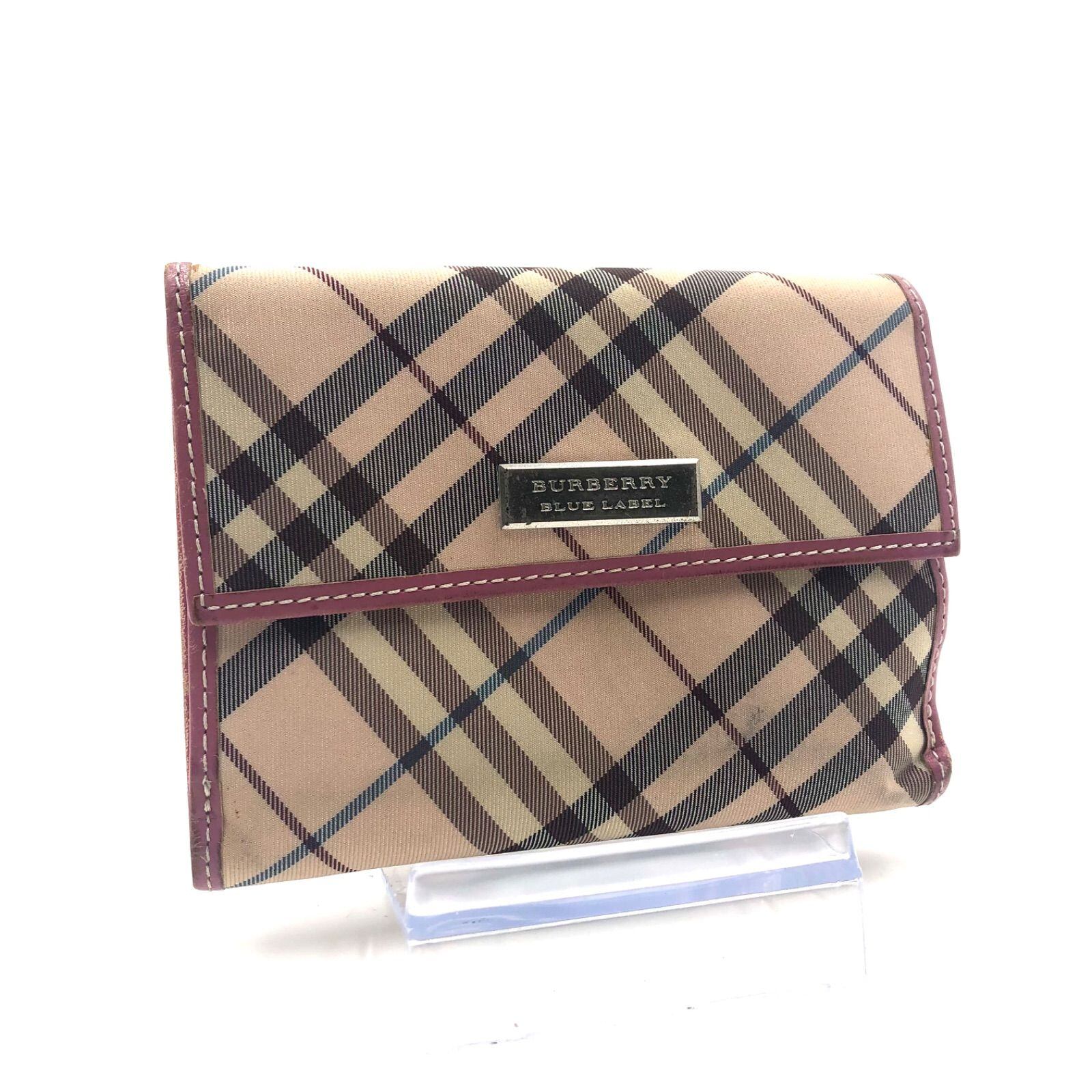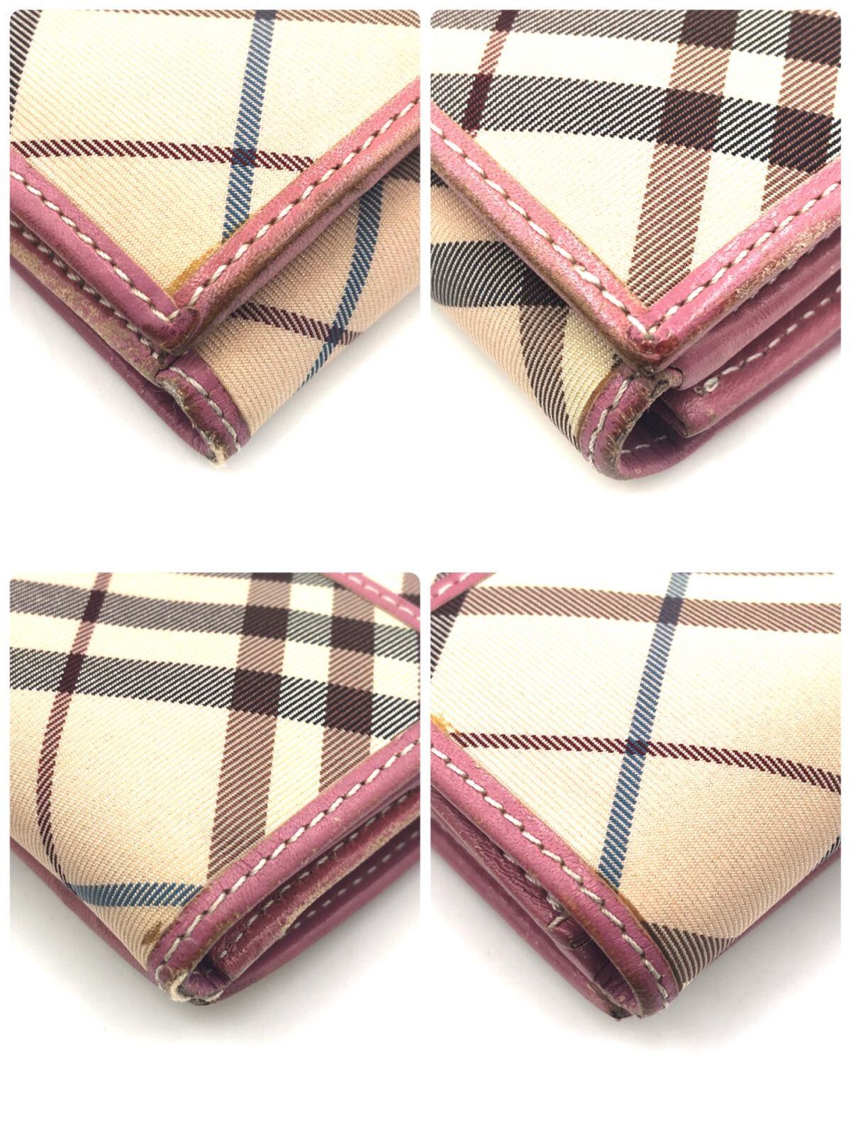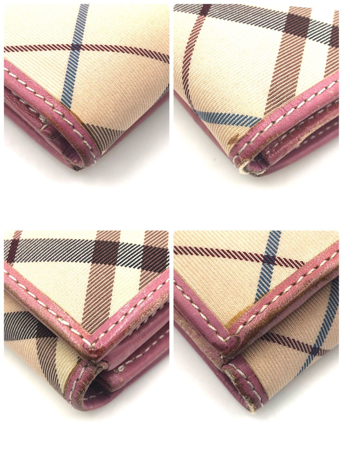 ■美品■BURBERRY BLUE LABEL バーバリーブルーレーベル ノバチェック総柄 折り財布 ベージュ×ピンク キャンバス×レザー シルバー金具