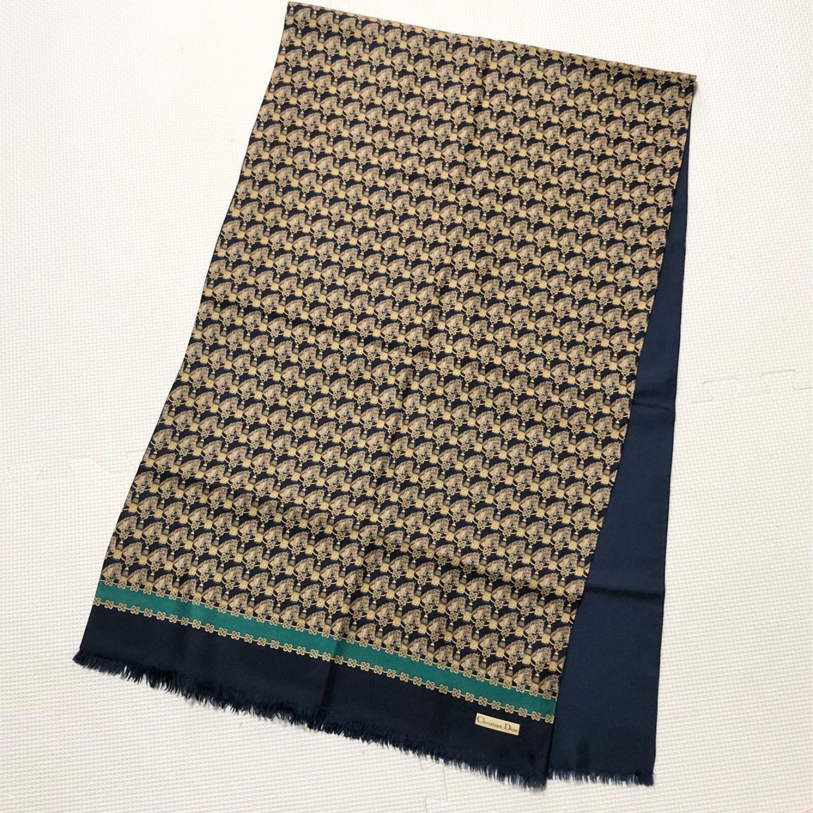 ■極上美品■Christian Dior クリスチャンディオール ロングストール シルクマフラー 150×46cm 馬とタッセル飾り 総柄 シルク100% イタリア製 ネイビー×ゴールドイエロー×ブラウン×ブルー×エメラルドグリーン レディース