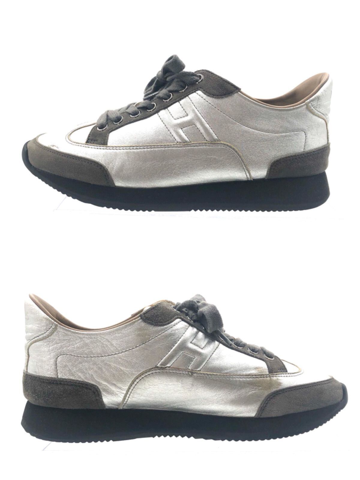 ■美品■HERMES エルメス クイック ローカット レザースニーカー シルバー×ダークブラウン スエード×レザー イタリア製 36.5(23~23.5cm) レディース 保存袋付き