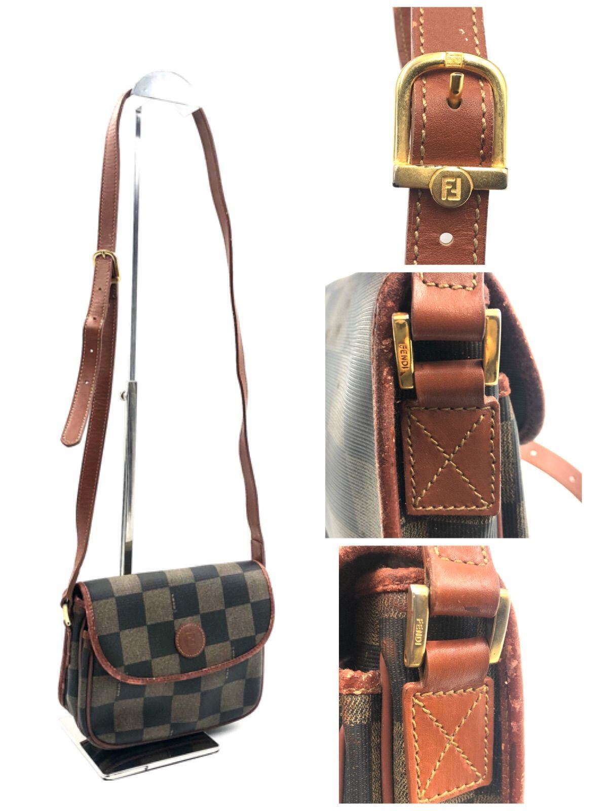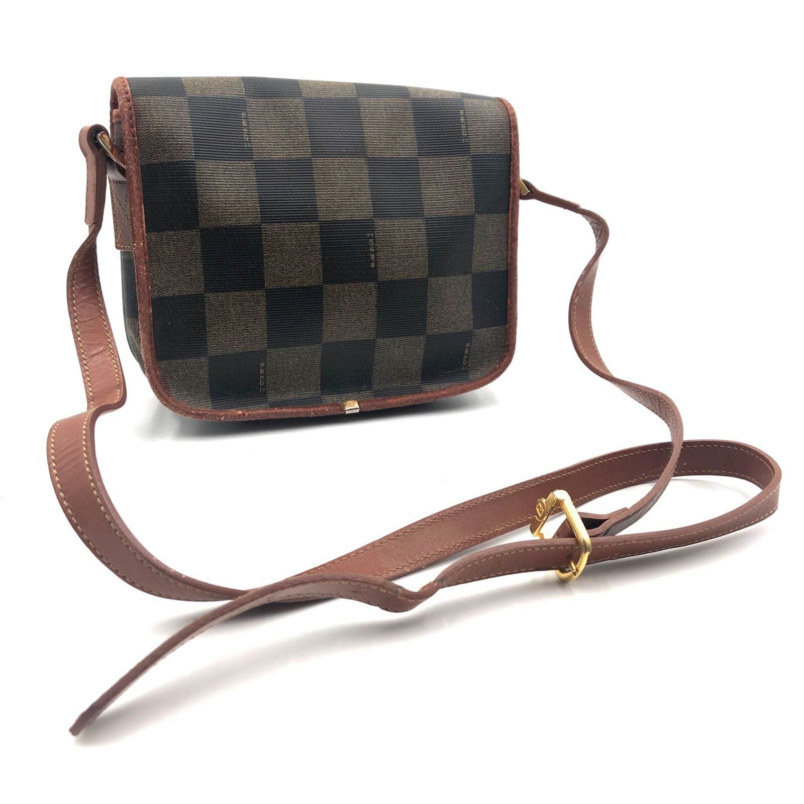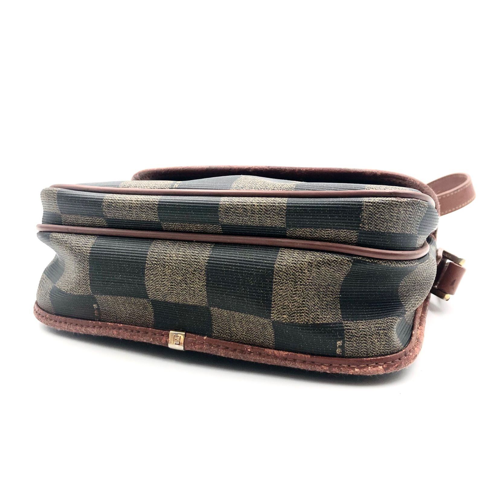 FENDI フェンディ ペカン チェック ショルダーバッグ クロスボディ 斜めがけ コーティングキャンバス×レザー ロゴプレート ベージュ×ブラック×ブラウン ゴールド金具 イタリア製 刻印あり レディース