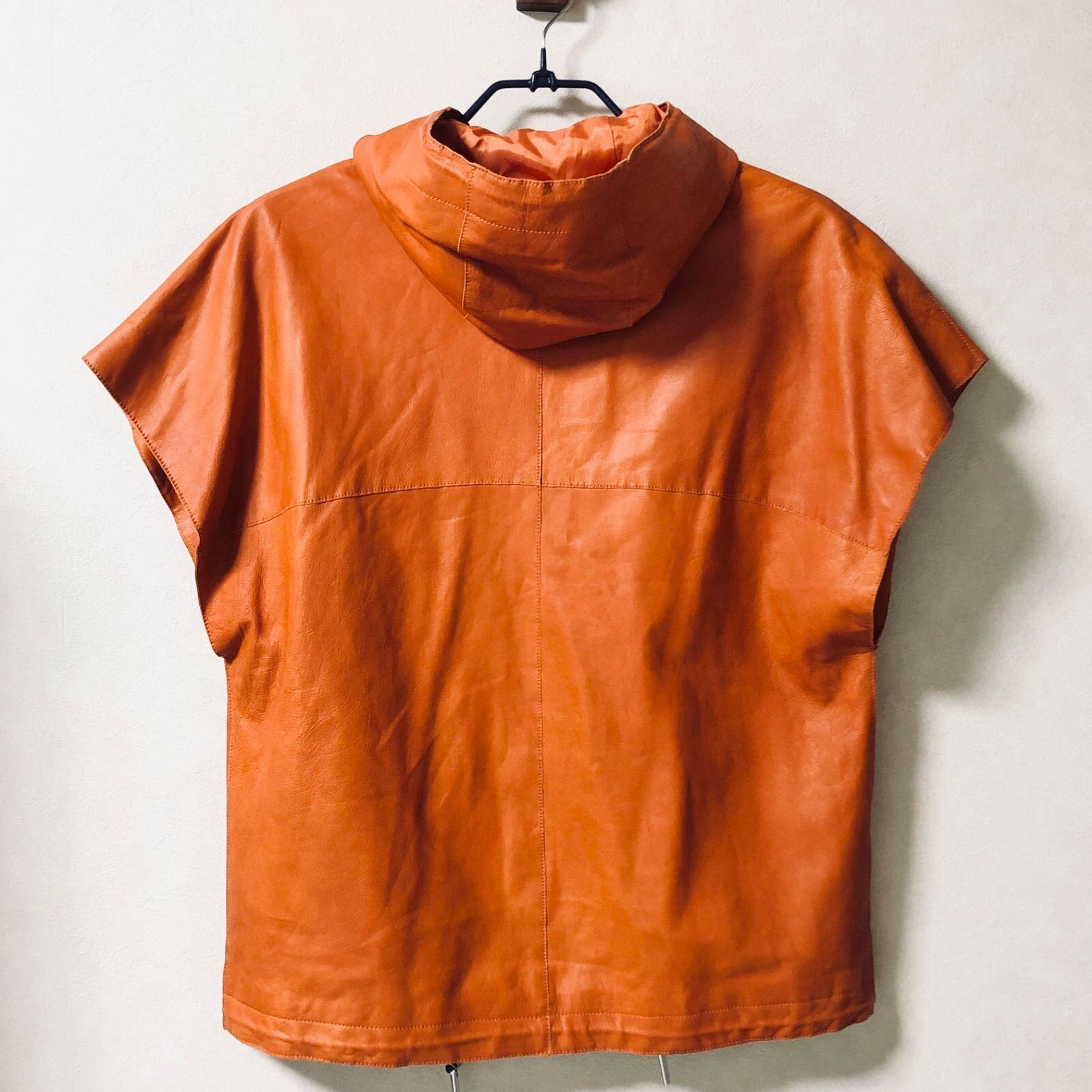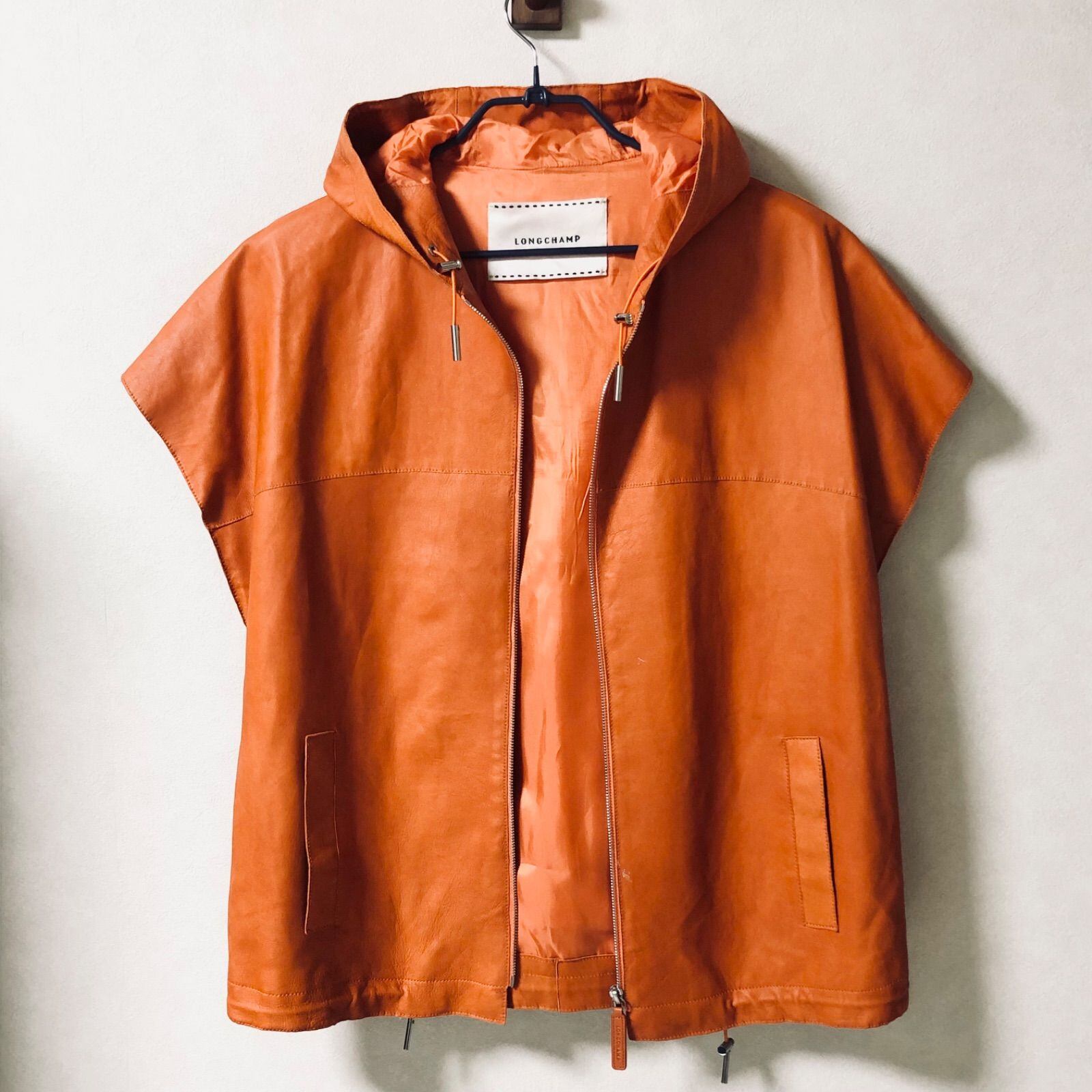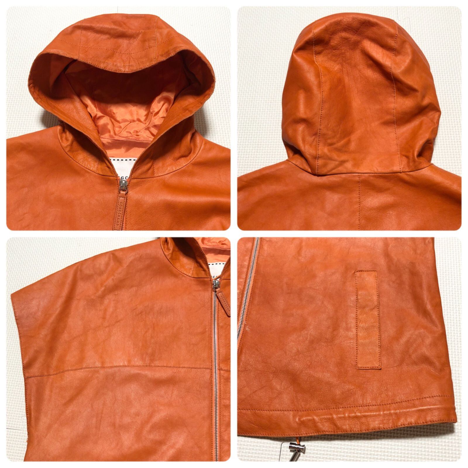 ■美品■稀少■LONDCHAMP ロンシャン 羊革レザーパーカー ジャケット フード フーディ フレンチスリーブ イタリア製 フルジップ オレンジ レディース L~XL程度
