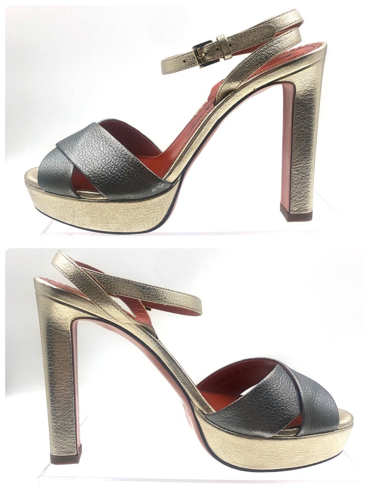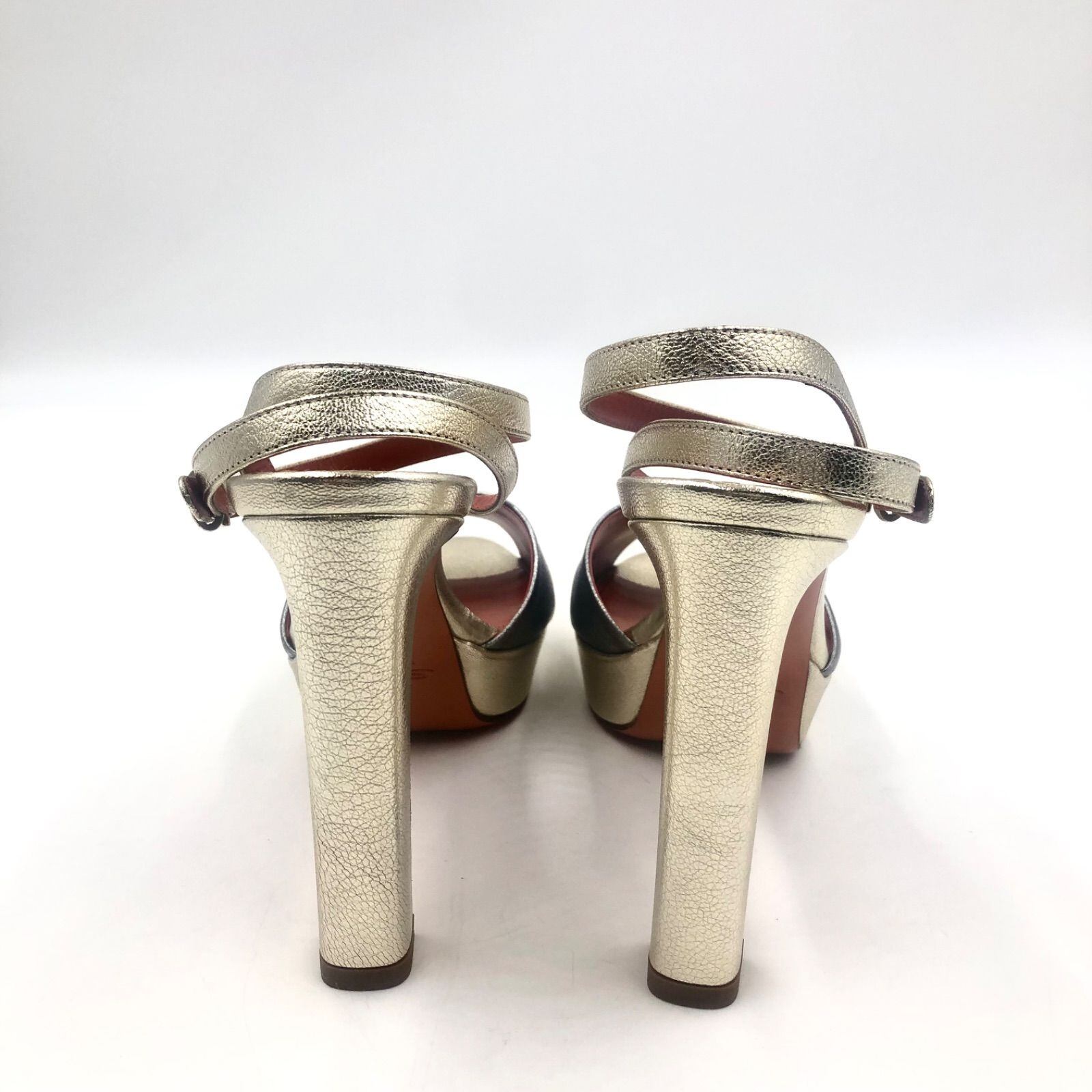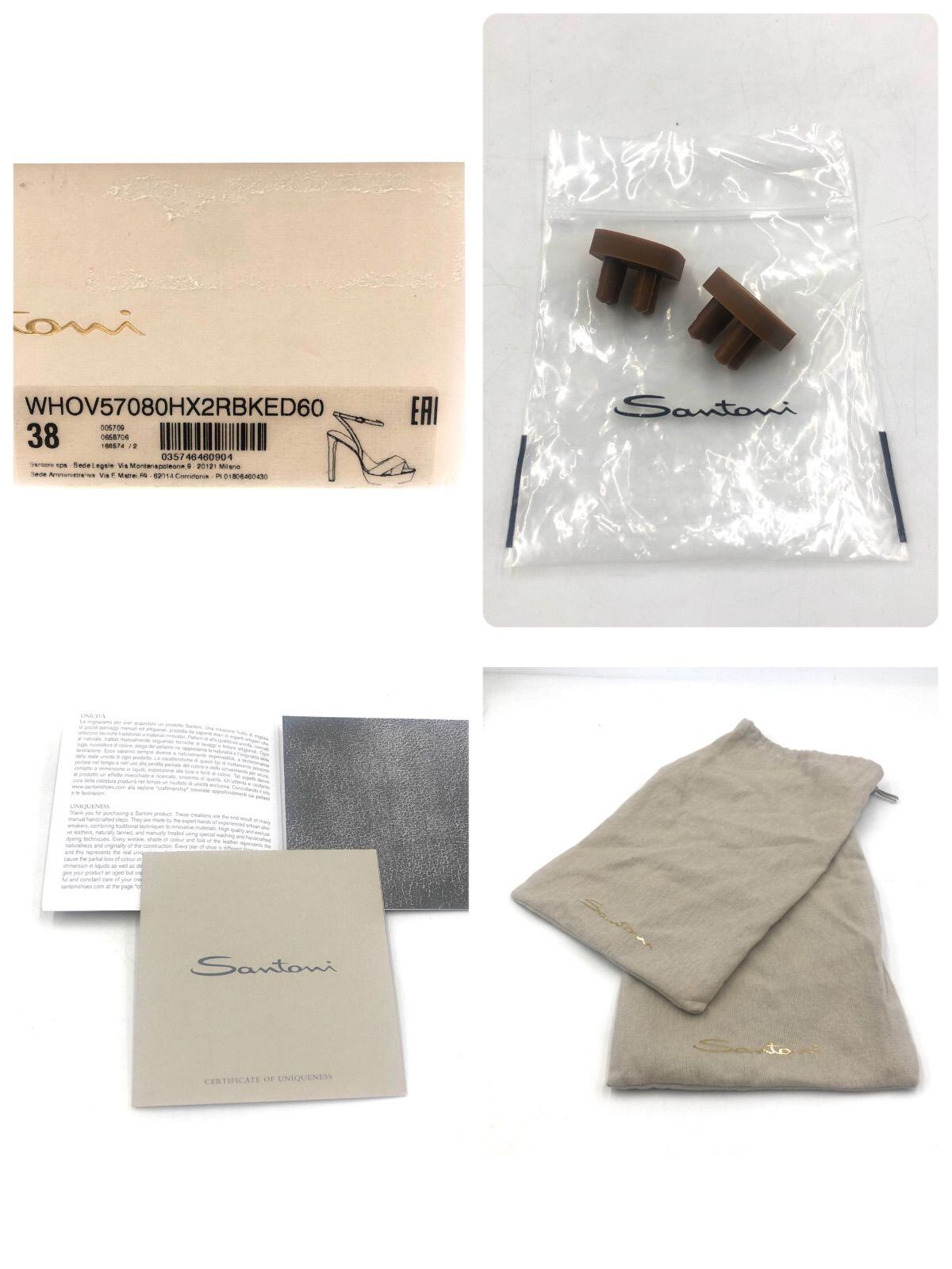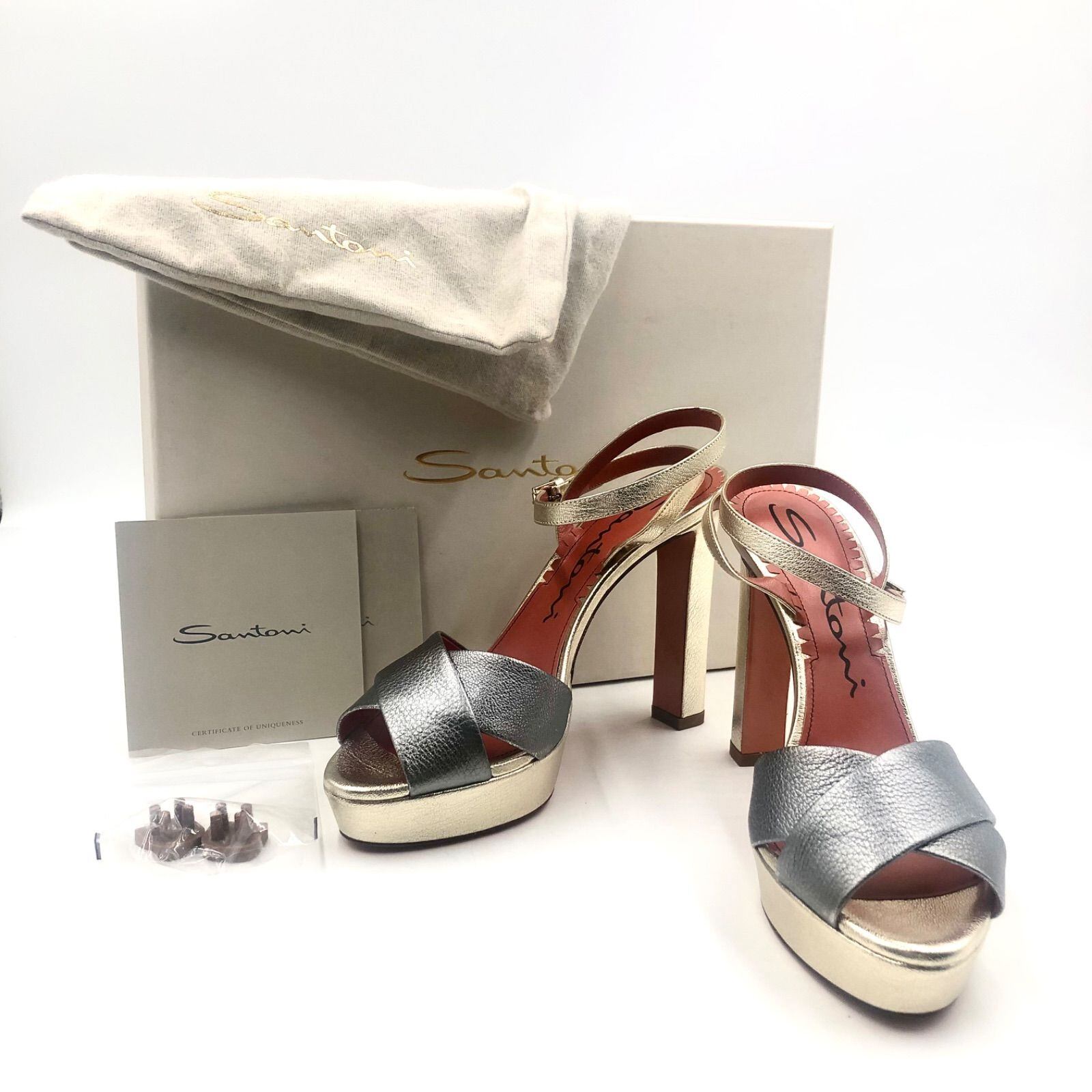■未使用品■Santoni サントーニ ハイヒール サンダル オープン レザー 本革 踵予備付き シルバー×ダークシルバー×オレンジ イタリア製 サイズ38(24cm) レディース 箱、保存袋、冊子付き