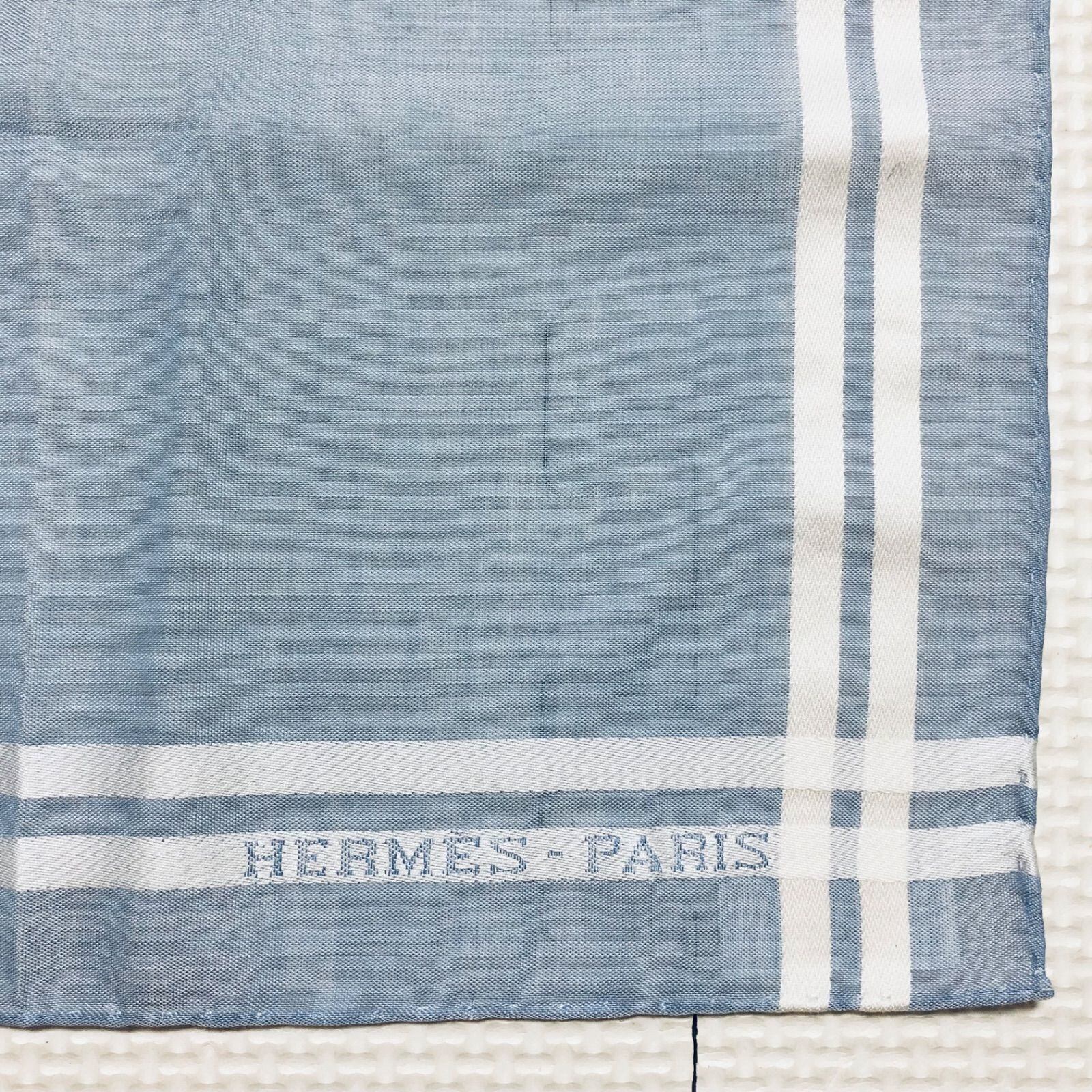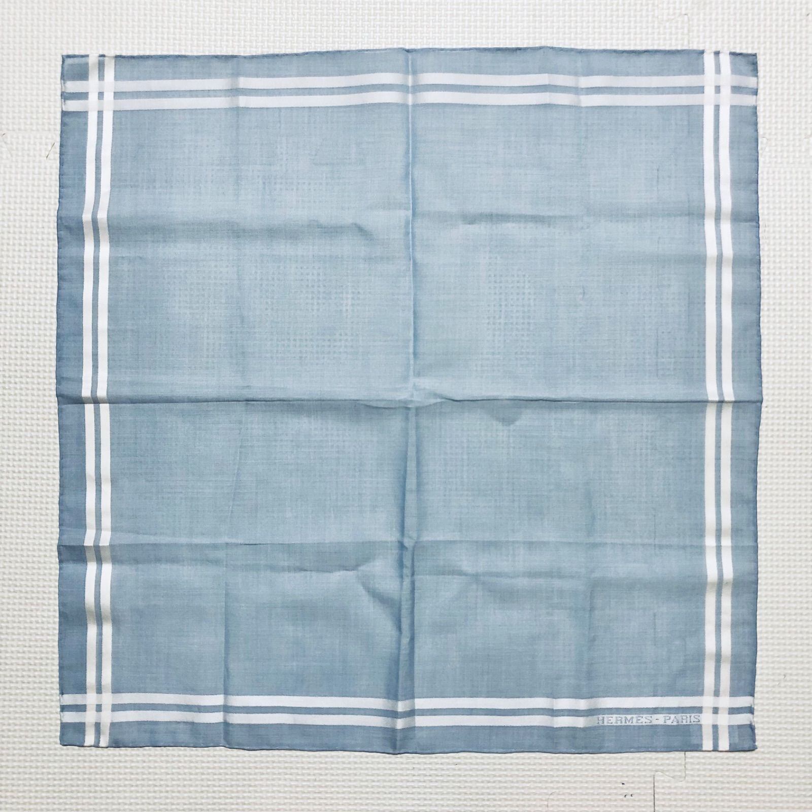 ■未使用品■HERMES エルメス ハンカチ チーフ 47×47cm 二重線ストライプ ライトブルー×ホワイト コットン100% 箱付き
