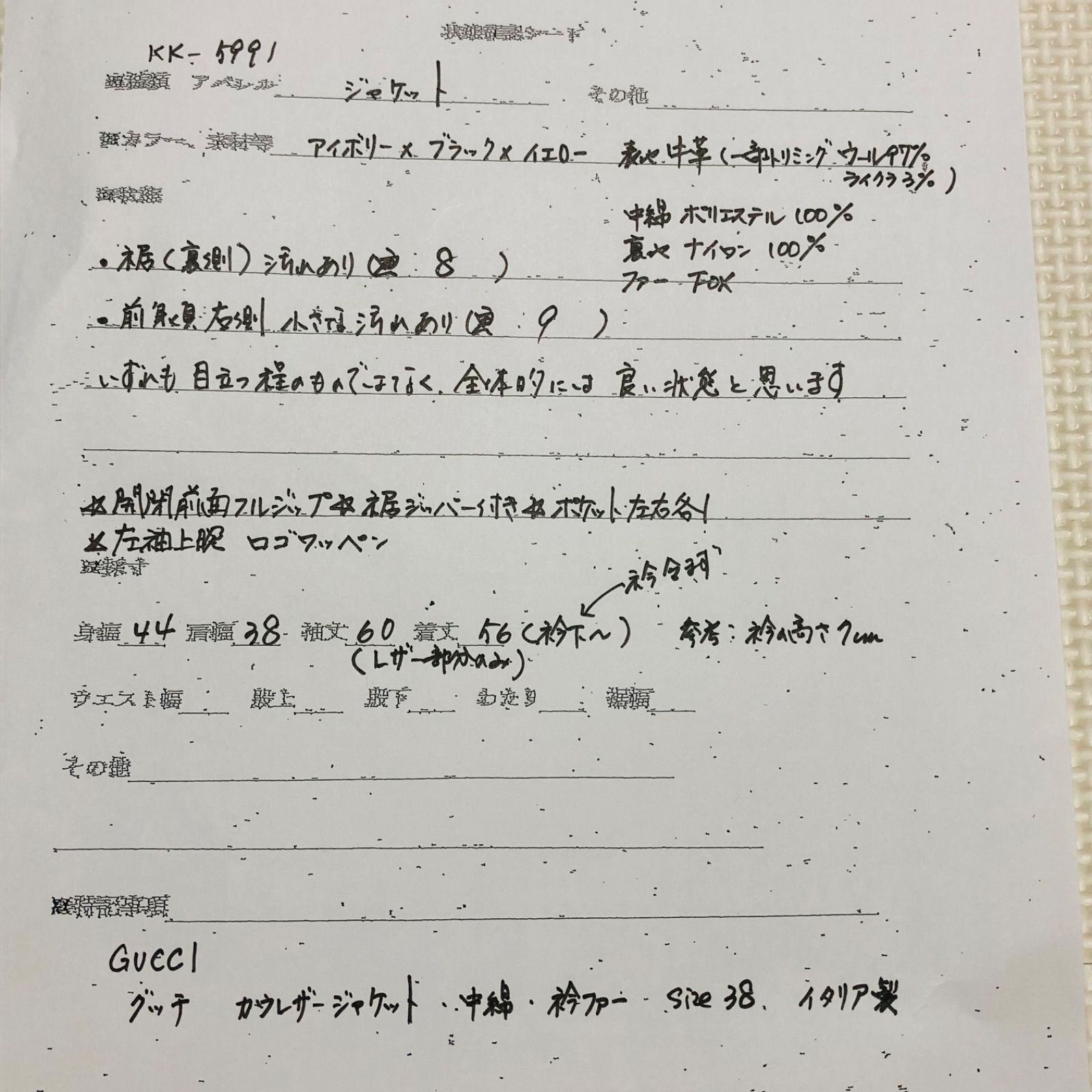 裾裏汚れ、前身頃右側の汚れ小※写真8〜9