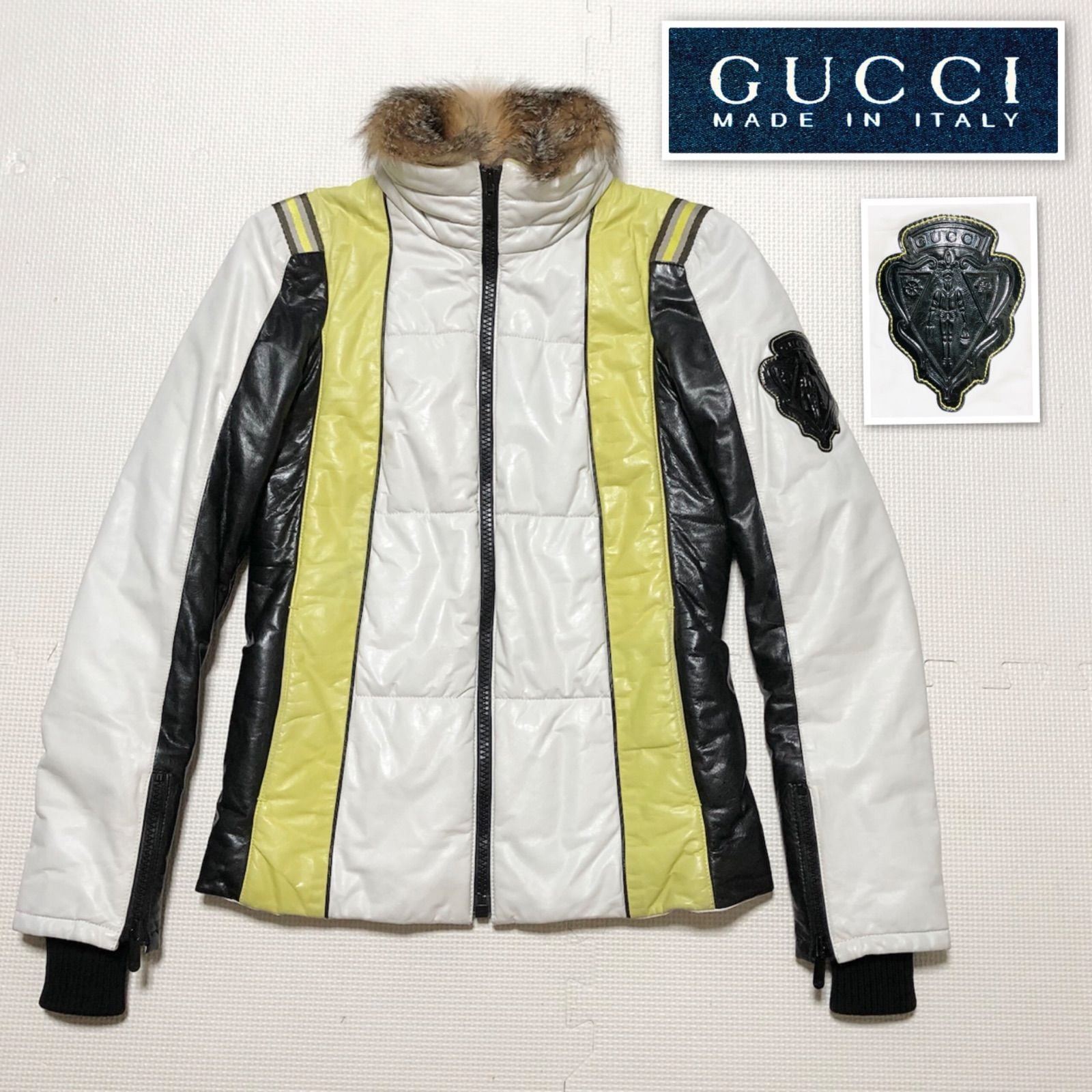 ■美品■超稀少■定価約70万円■GUCCI グッチ トムフォード期 腕ロゴワッペン レザージャケット ブルゾン ジャンパー 牛革 キルティング 中綿 フォックスファー size38(M) イタリア製 レディース ホワイト系アイボリー×ブラック×イエロー