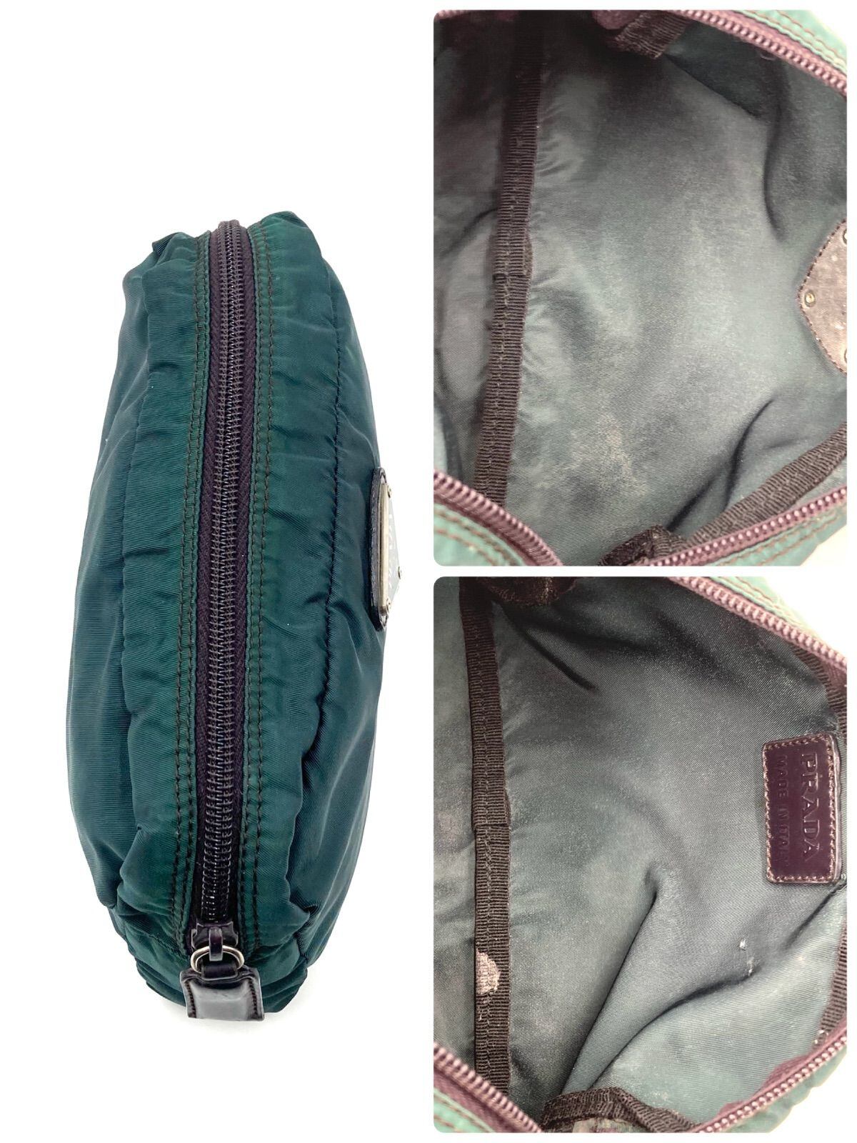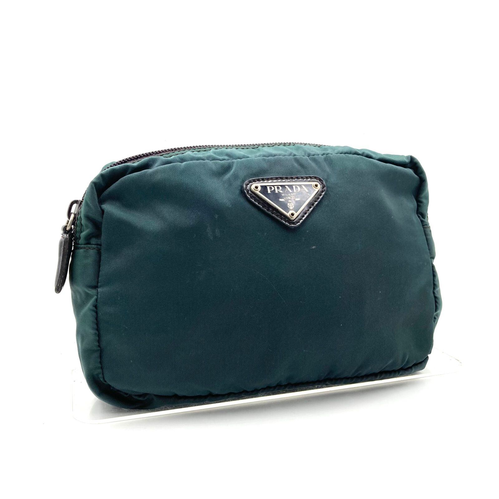 ■表側美品■PRADA プラダ テスートナイロン「ポコノ」 コスメポーチ 三角プレート グリーン イタリア製 白タグあり レディース