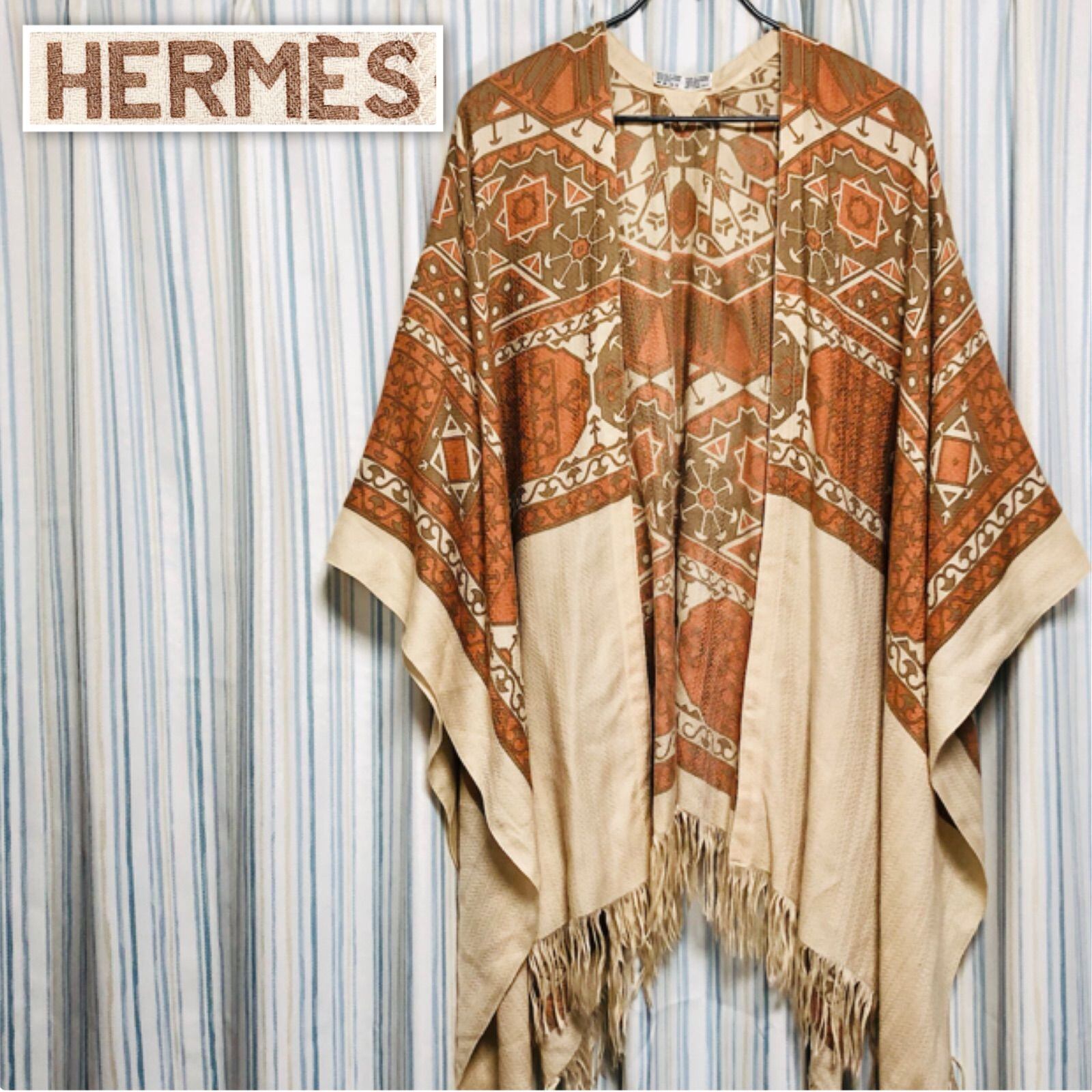 ■超希少■カシミヤ65%■HERMES エルメス アラビア ポンチョストール ロングストール カシミヤ65% シルク35% フランス製 ベージュ×ライトブラウン×オレンジ フリンジ レディース