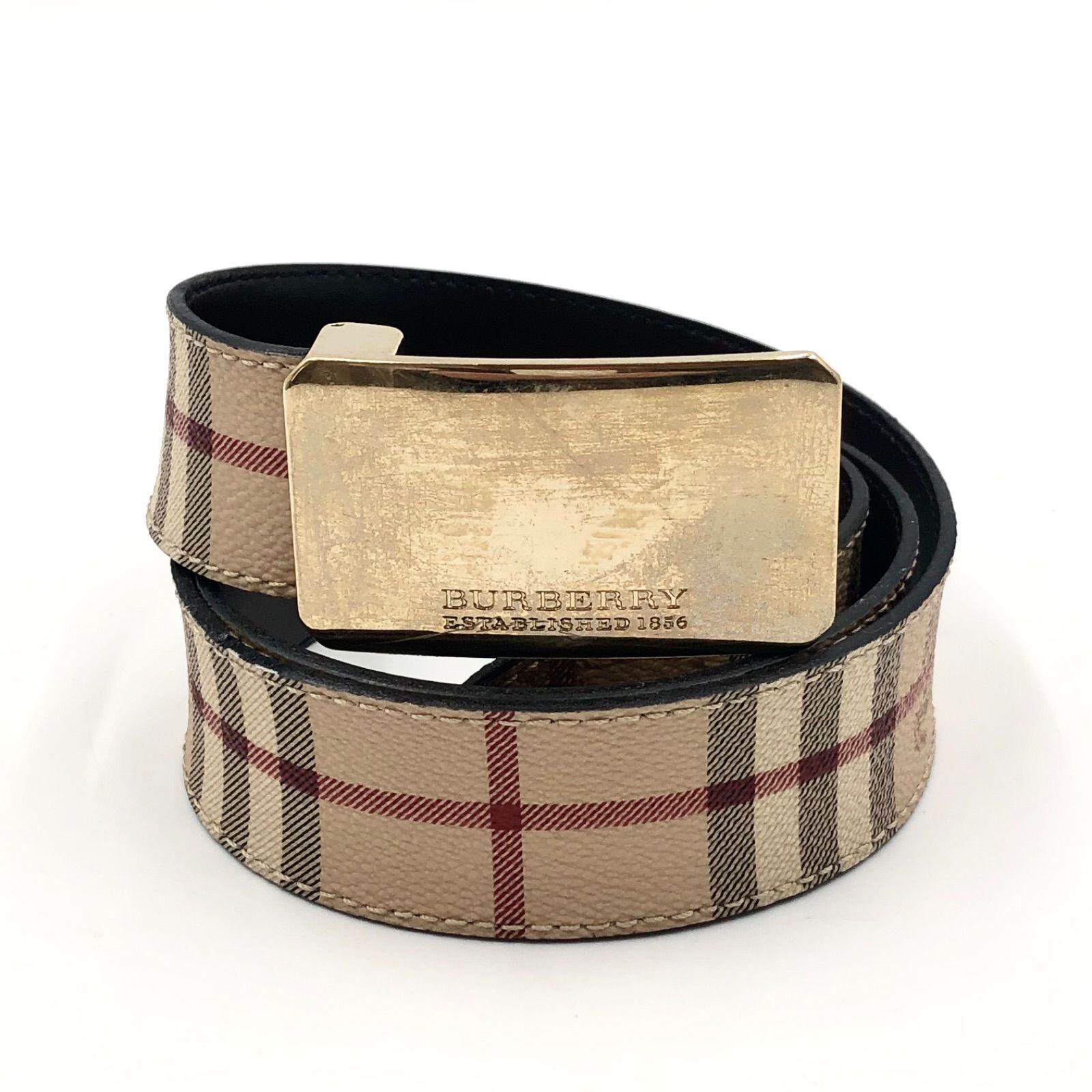 BURBERRY バーバリー ベルト ノバチェック×シャドーホース ゴールド金具 PVC×レザー イタリア製 刻印あり ウエスト最大87.5cm 最小77.5cm メンズ 箱、保存袋付き