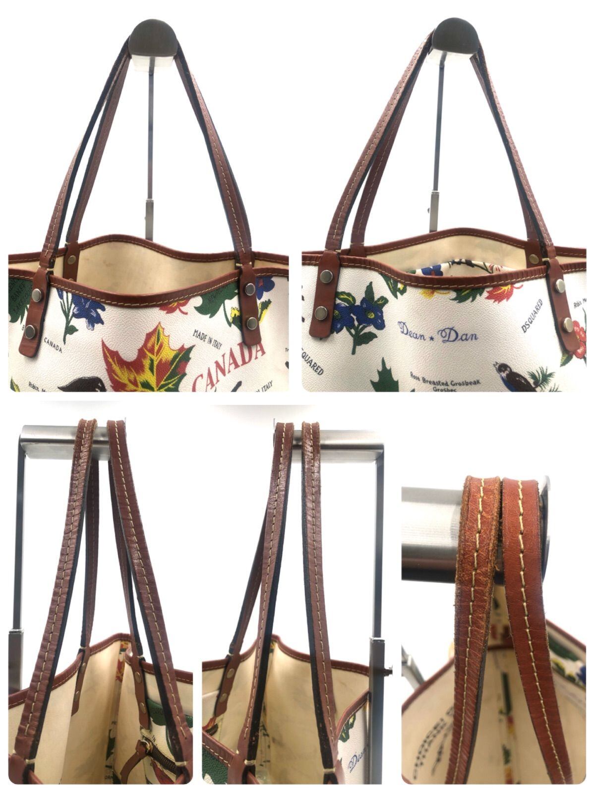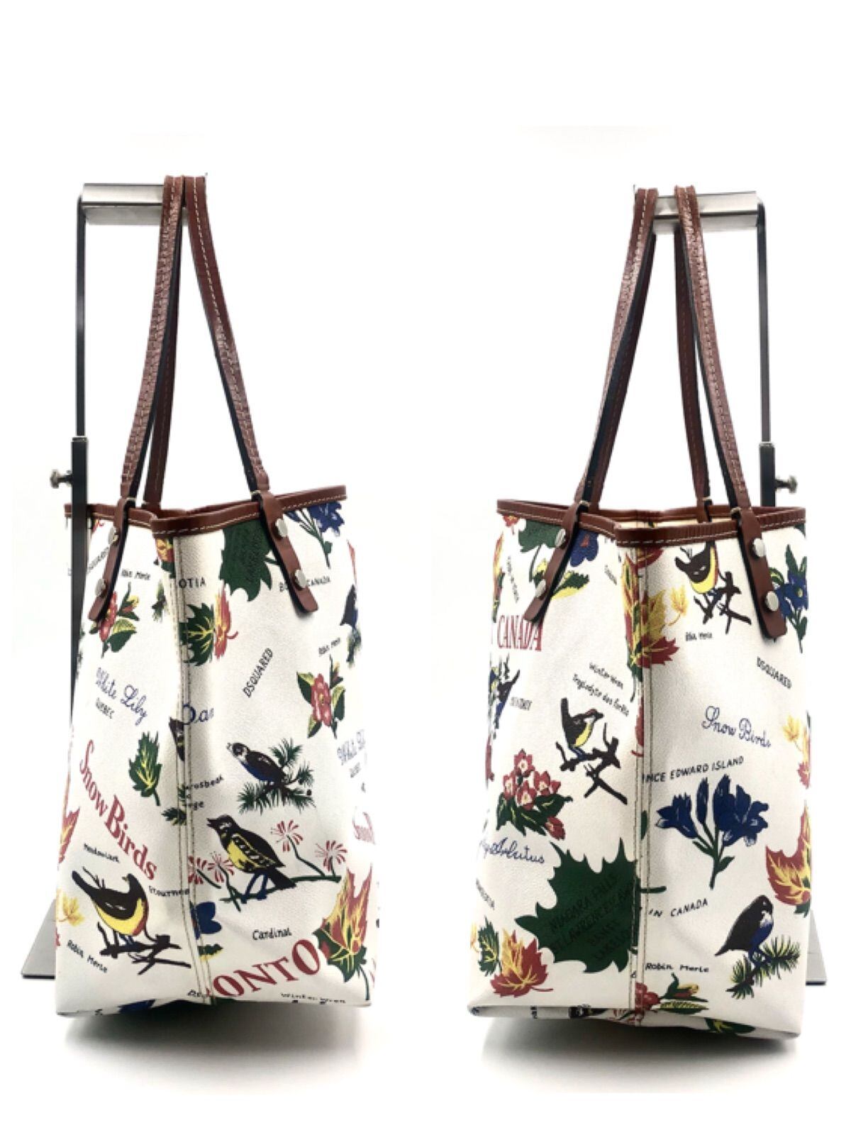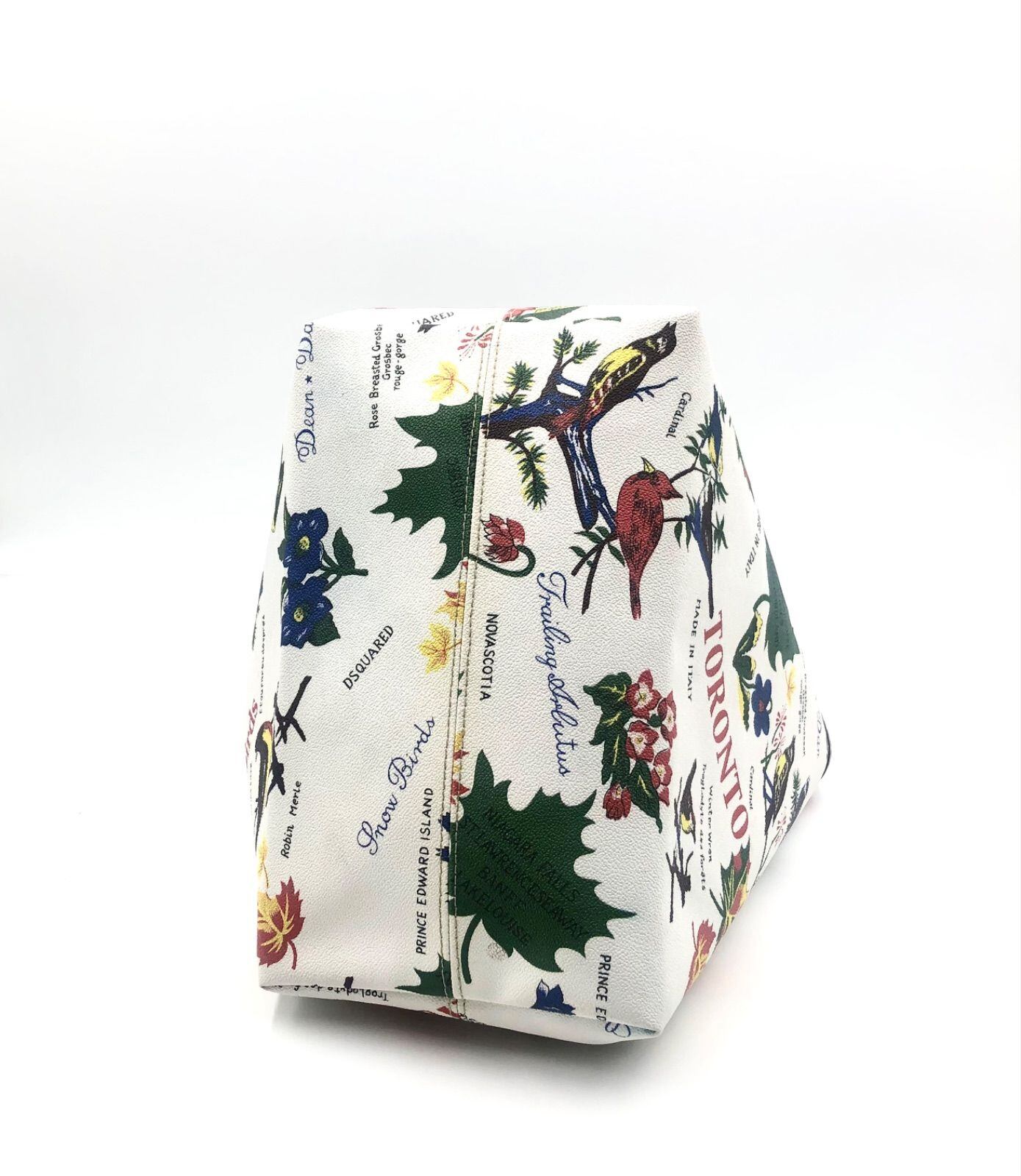 ■美品■Dsquared2 ディースクエアード プリントトートバッグ PVC×レザー イタリア製 カナダアイコンデザイン 花 葉 鳥 ホワイト×マルチカラー A4可 ショッピング レディース