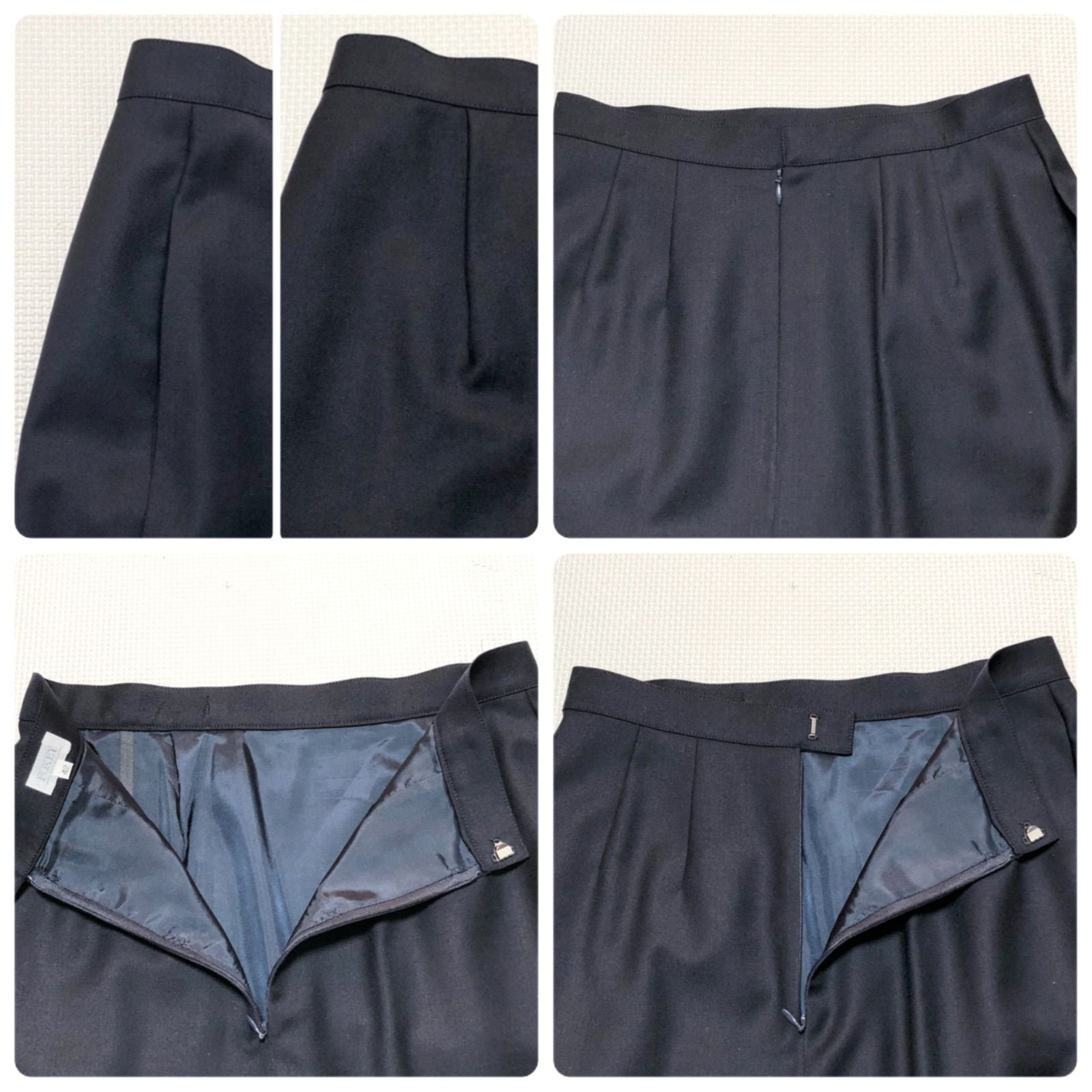 ■美品■希少カシミヤ混■FOXY BOUTIQUE フォクシーブティック カシミヤ混ウール セットアップスカートスーツ サクセススーツ size42(L) ダークネイビー シングル4つボタン 肩パッド ひざ丈スカート 日本製 レディース