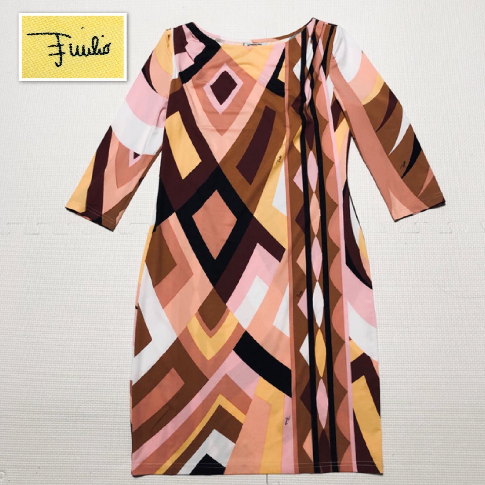 ■美品■EMILIO PUCCI エミリオプッチ 七分袖ワンピース 現代美術風 総柄 size36(S) イタリア製 ブラウン系マルチカラー レディース シルク100% ストレッチ素材