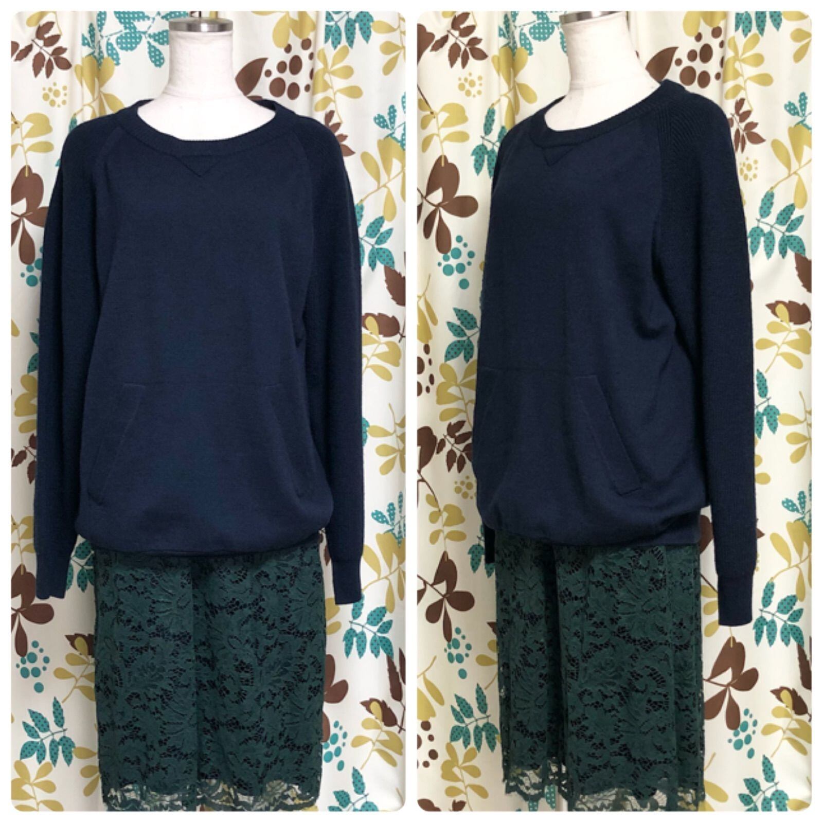 ■美品■sacai luck サカイラック ドッキングワンピース ニット+レース ラグラン カンガルーポケット size3(L) ネイビー×グリーン レディース