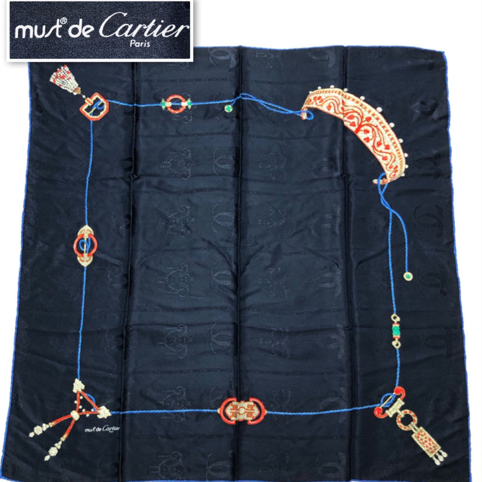 ■美品■Cartier カルティエ must de Cartier マストドゥカルティエ 大判スカーフ ジュエリー シャドーロゴ 総柄 ネイビー×マルチカラー シルク100% イタリア製 布タグあり レディース
