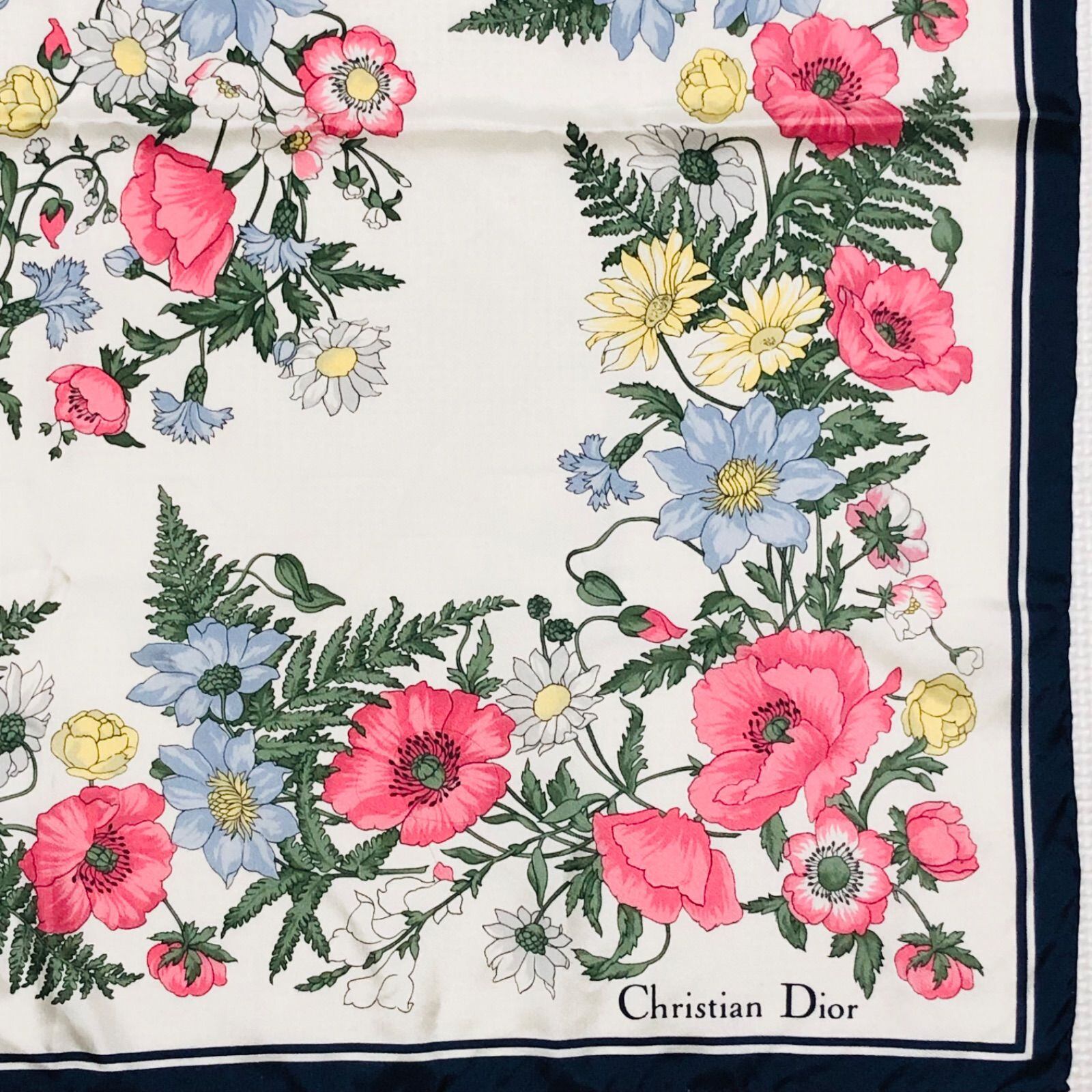 ■良品■Christian Dior クリスチャンディオール スカーフ 65×68cm花柄 フラワー 総柄 シルク100% イタリア製 アイボリー×ネイビー×マルチカラー レディース
