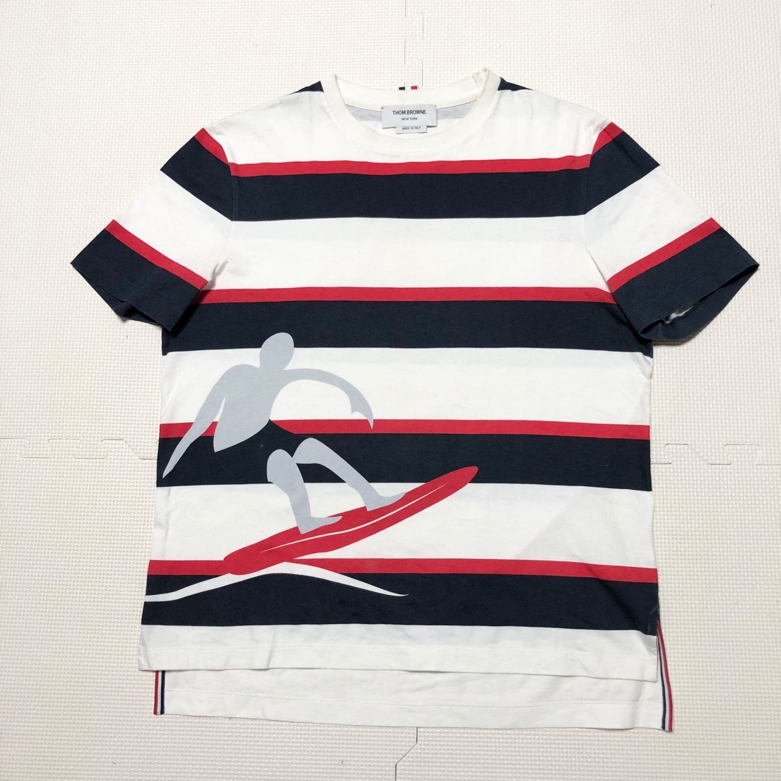 ■良品■希少■THOM BROWNE トムブラウン トリコロール 半袖Tシャツ ボーダー×サーファー size1(S) イタリア製 ホワイト×ブラック×レッド×グレー イタリア製 コットン タグあり メンズ モダンアメリカントラディショナル