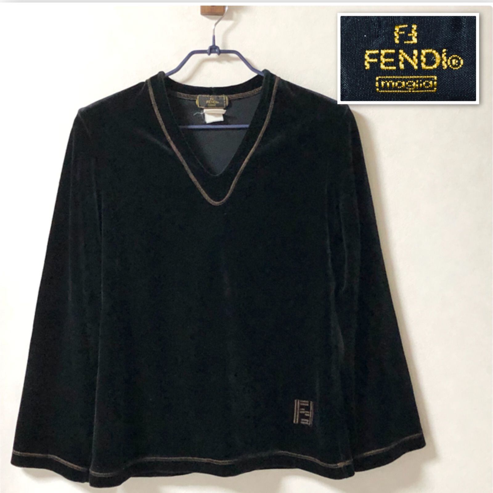 ■美品■FENDI フェンディ FFロゴ刺しゅう ベロアトップス 長袖 Vネック コットン×レーヨン イタリア製 タグあり ブラック×ベージュ レディース