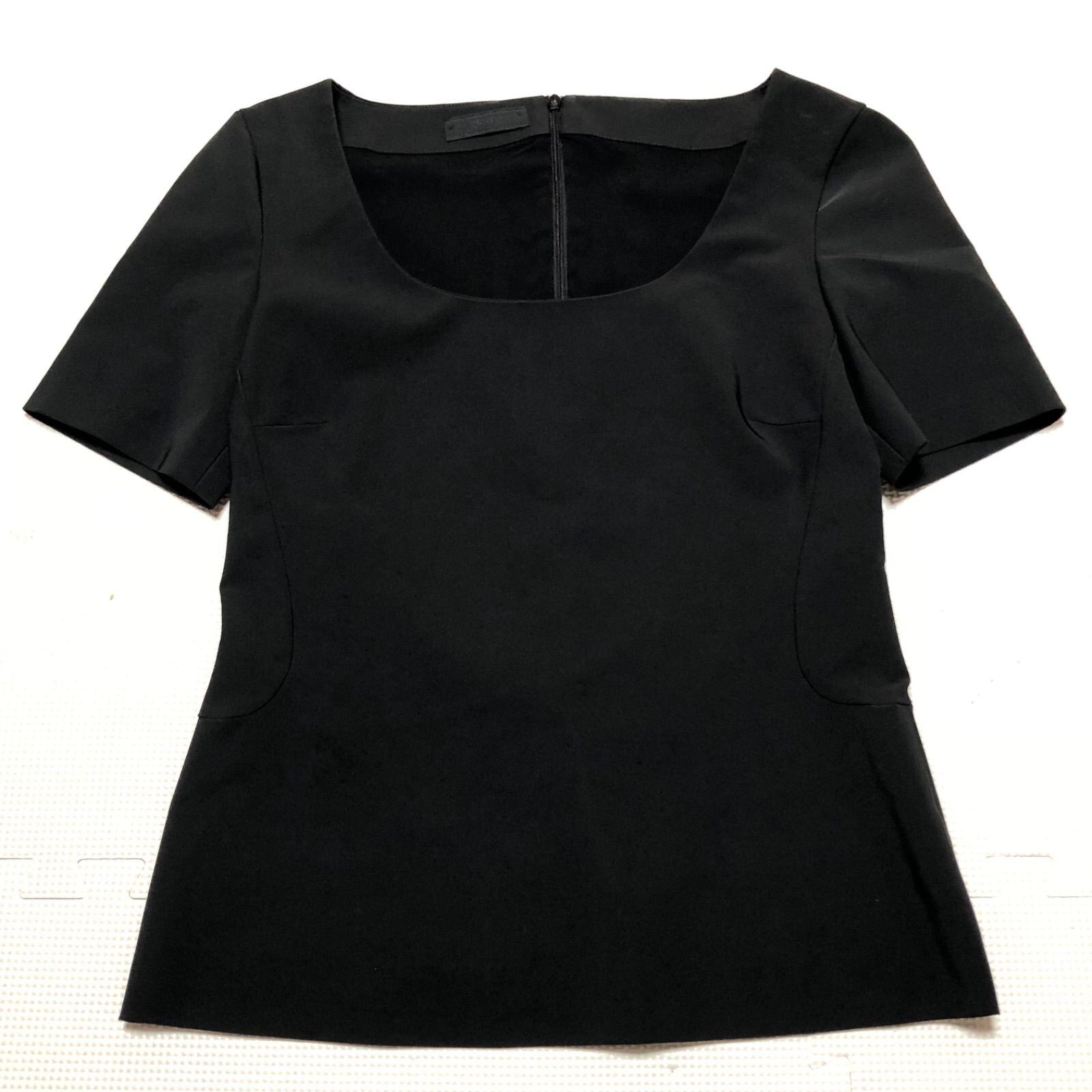 ■良品■PRADA プラダ 半袖トップス ノーカラー ラウンドネック 無地ブラック size42(L) イタリア製 ポリエステル90%エラスタン10% ストレッチ素材 伸縮性あり レディース