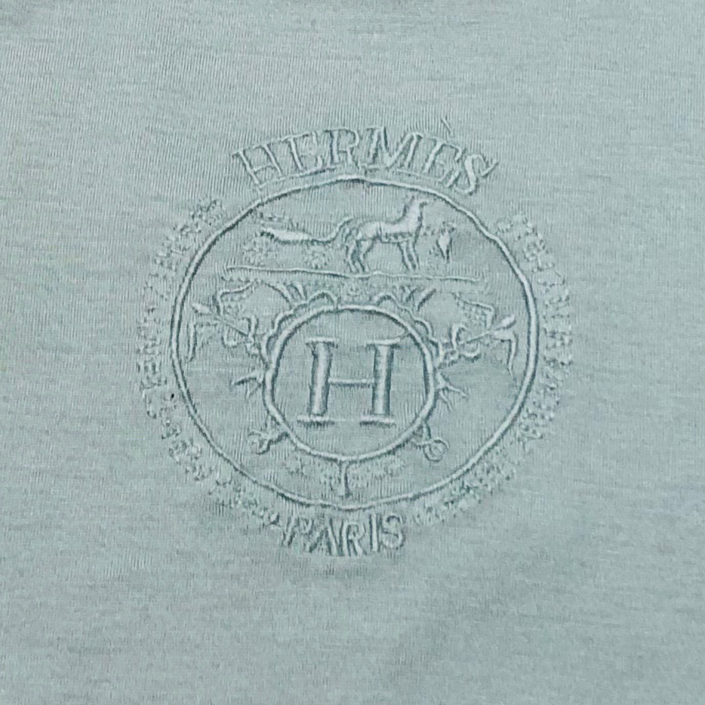 HERMES エルメス Tシャツ 半袖 左胸刺繍ロゴエンブレム サイズM~L相当 イタリア製 薄青緑系 コットン100% メンズ