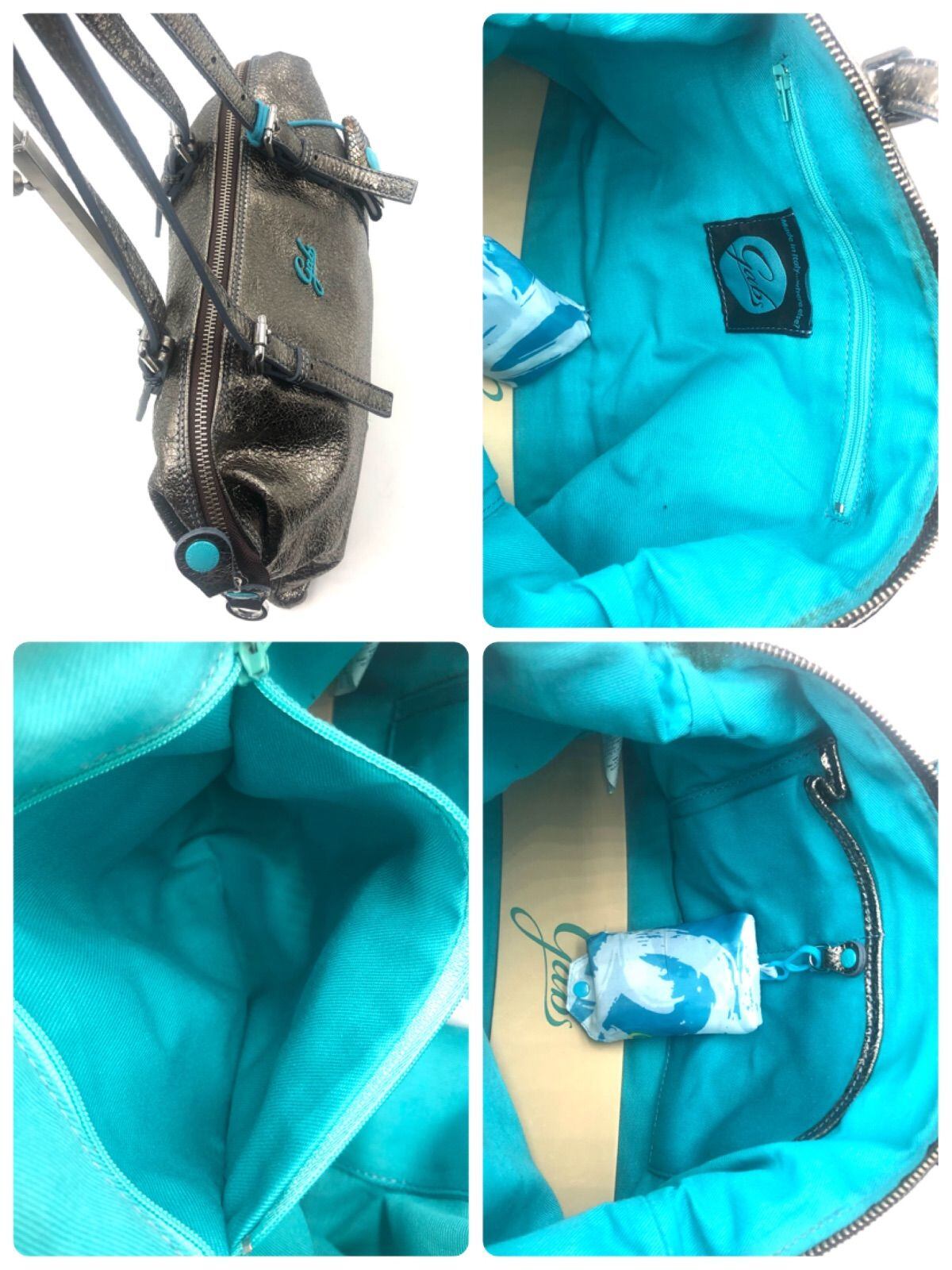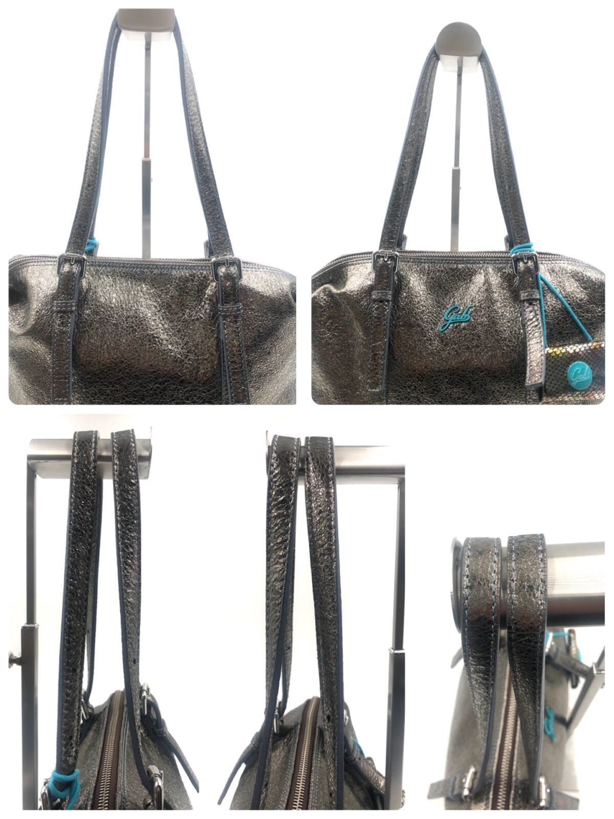 ■極美品■GABS ガブス 2way トートバッグ ショルダーバッグ エコバッグ付き 斜めがけ レザー ダークシルバー×ライトブルー チャーム イタリア製 保存袋 レディース