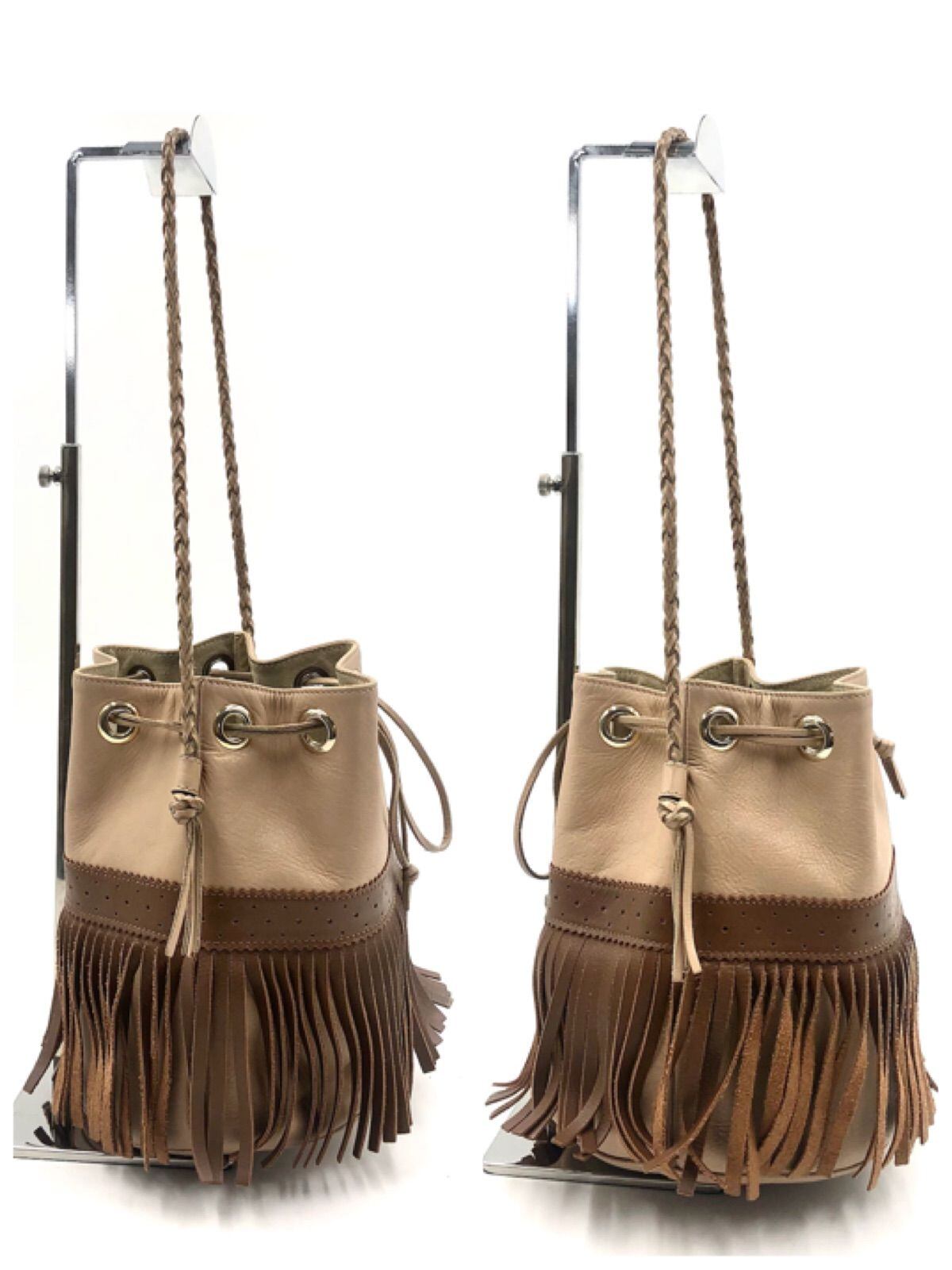 ■極美品■J&M DAVIDSON ジェイアンドエムデヴィッドソン カーニバル フリンジバッグ ショルダーバッグ ベージュ×ブラウン スペイン製 巾着 レザー 本革 レディース 保存袋
