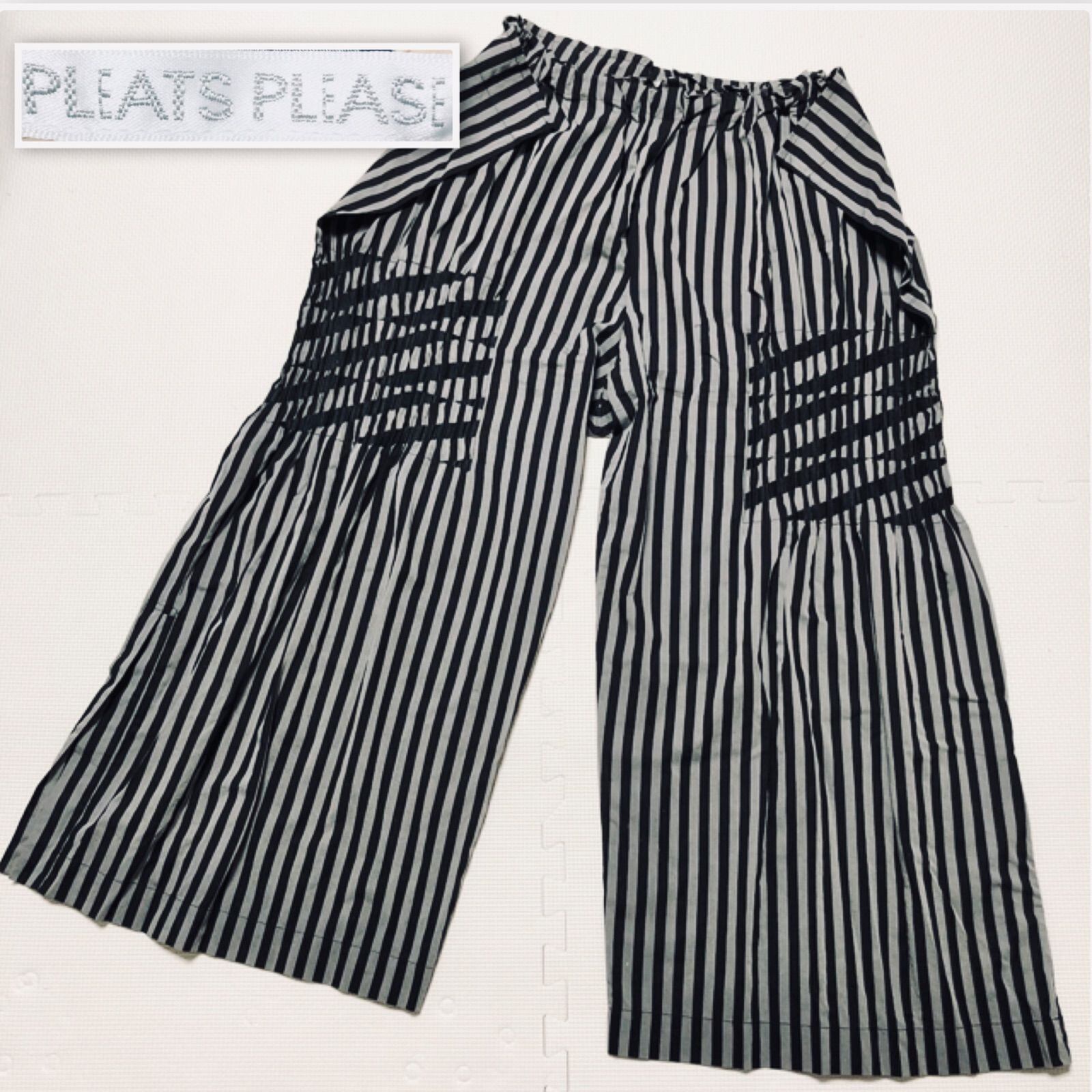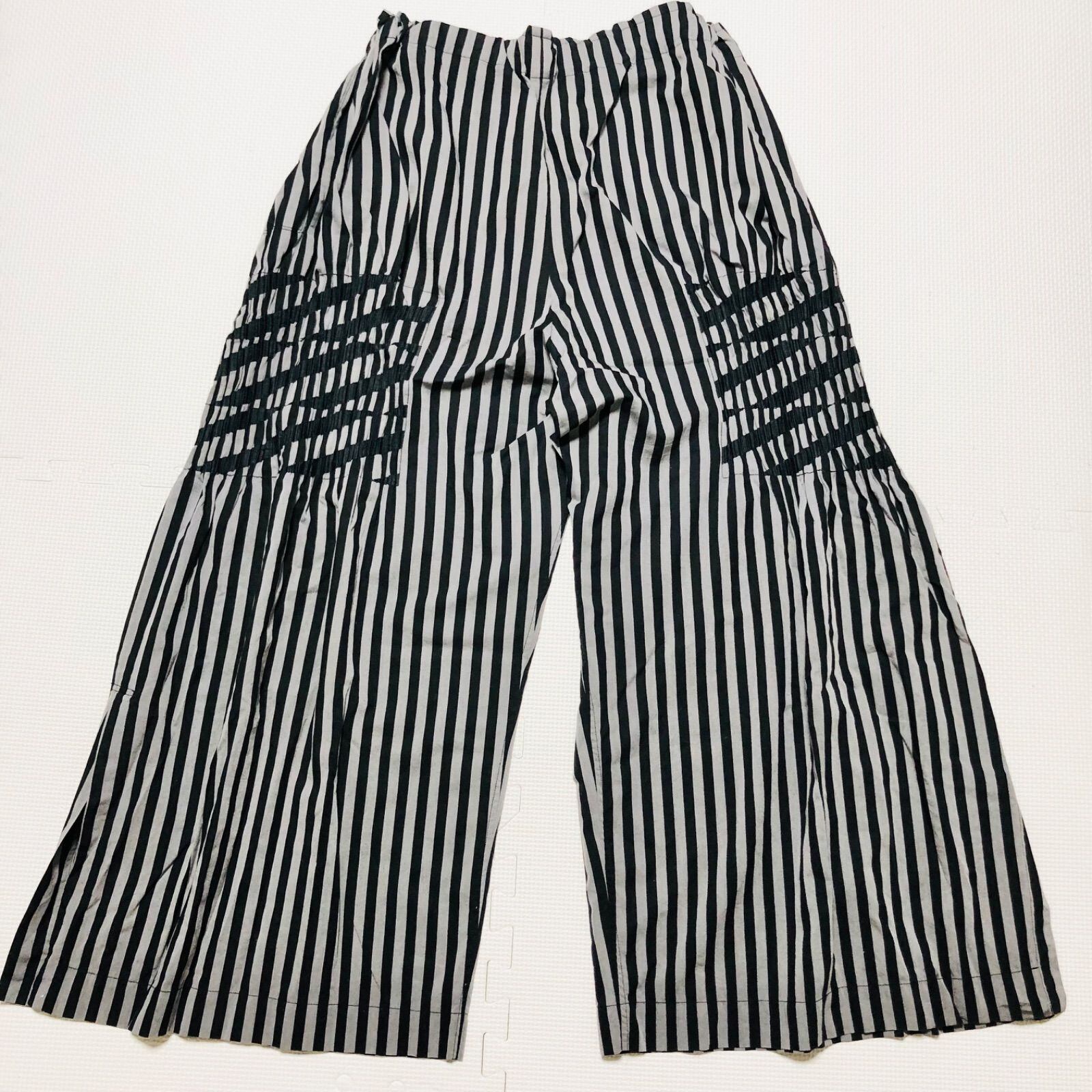 ■極美品■PLEATS PLEASE プリーツプリーズ ワイドパンツ ストライプ size5(XL相当) 日本製 イッセイミヤケ ウエスト総ゴム ももシャーリング加工 脚両サイドスリット 大きい 大きめ ビッグサイズ レディース グレー×ブラック