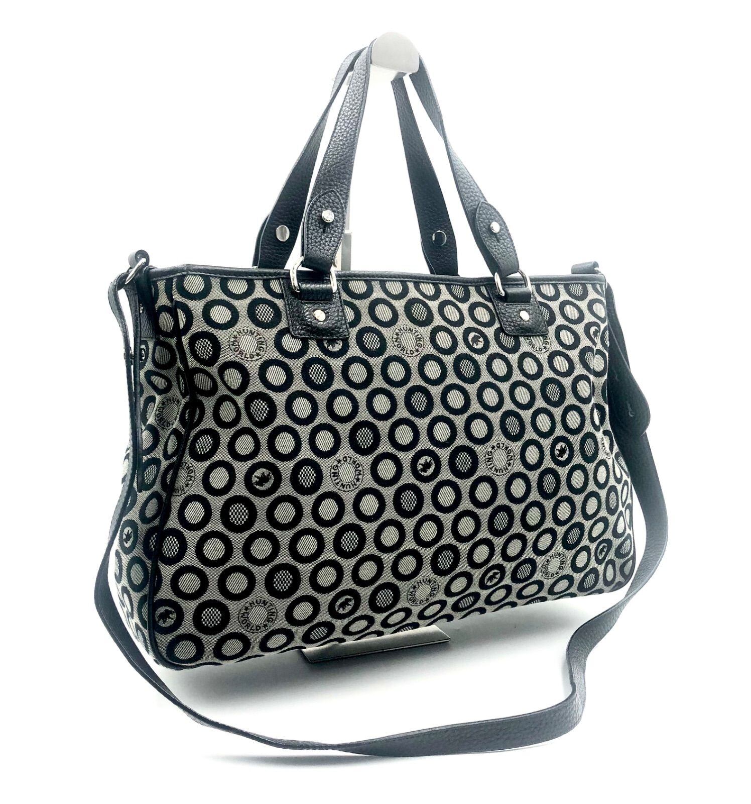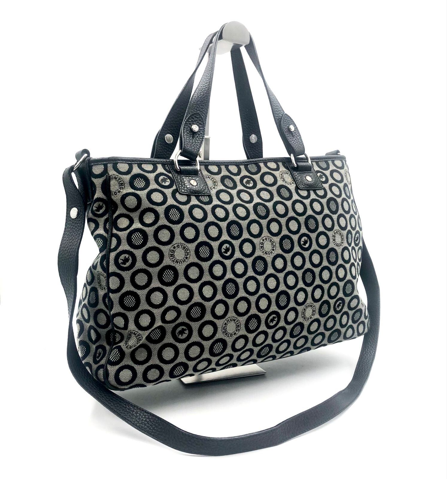 ■極美品■希少■Hunting World ハンティングワールド ロゴサークル総柄 2wayショルダーバッグ トートバッグ 斜めがけ キャンバス×レザー グレー×ブラック シルバー金具 ルーマニア製 刻印あり