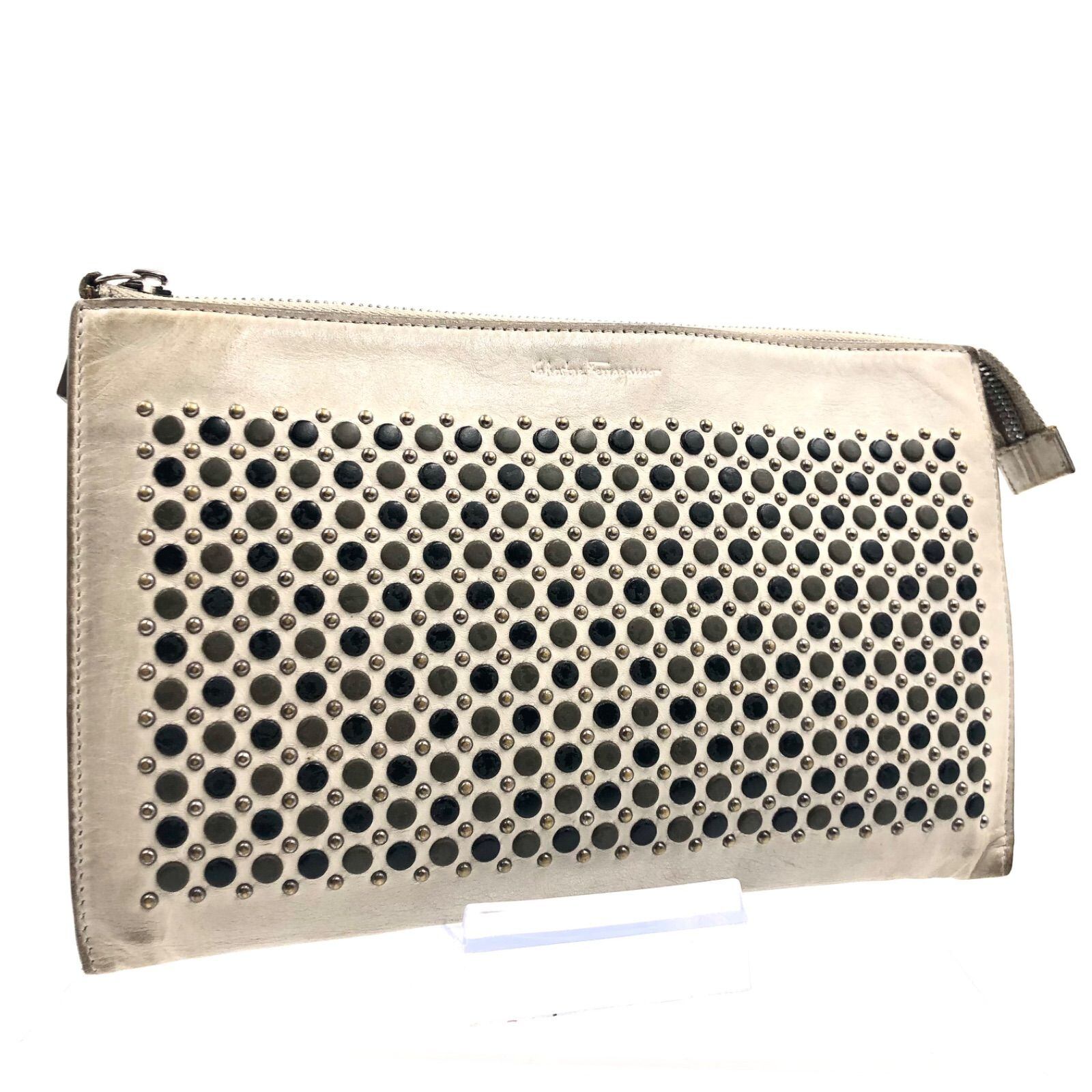 Salvatore Ferragamo サルヴァトーレフェラガモ 水玉スタッズ クラッチバッグ パーティーバッグ ポーチ レザー 本革 アイボリー×ブラック×シルバー イタリア製 刻印あり レディース