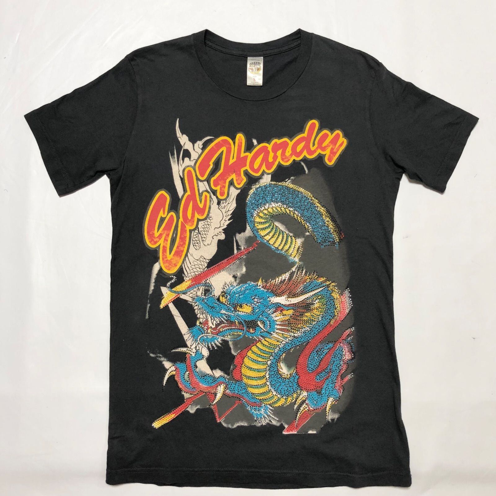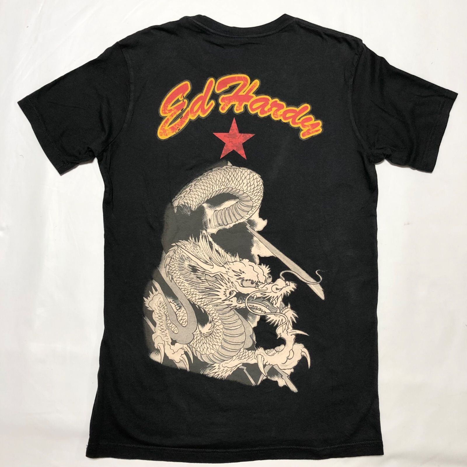 ■美品■Ed Hardy エドハーディー 半袖 Tシャツ ロング丈 ドラゴン 竜 龍 裏表柄あり sizeS 米国製 ブラック 夏 サマー