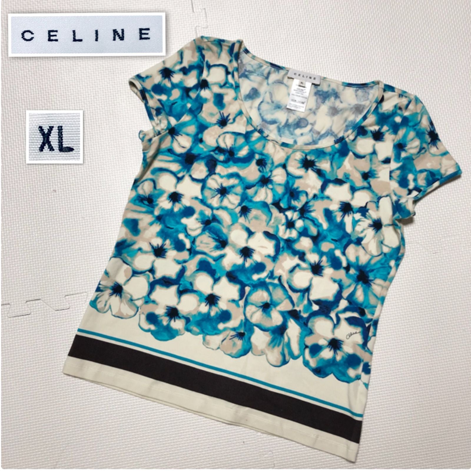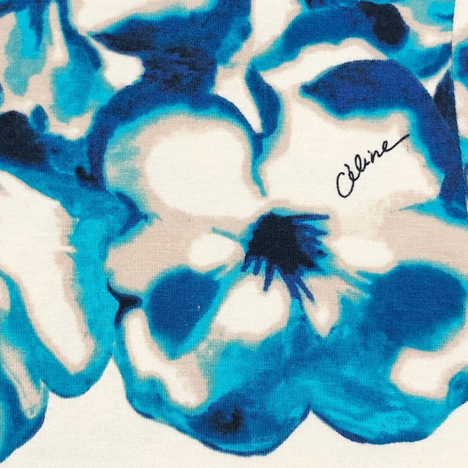 ■美品■CELINE セリーヌ Tシャツ 半袖 花柄 フラワー 総柄 ロゴ sizeXL チュニジア製 ブルー×ベージュ コットン100% レディース 大きめ
