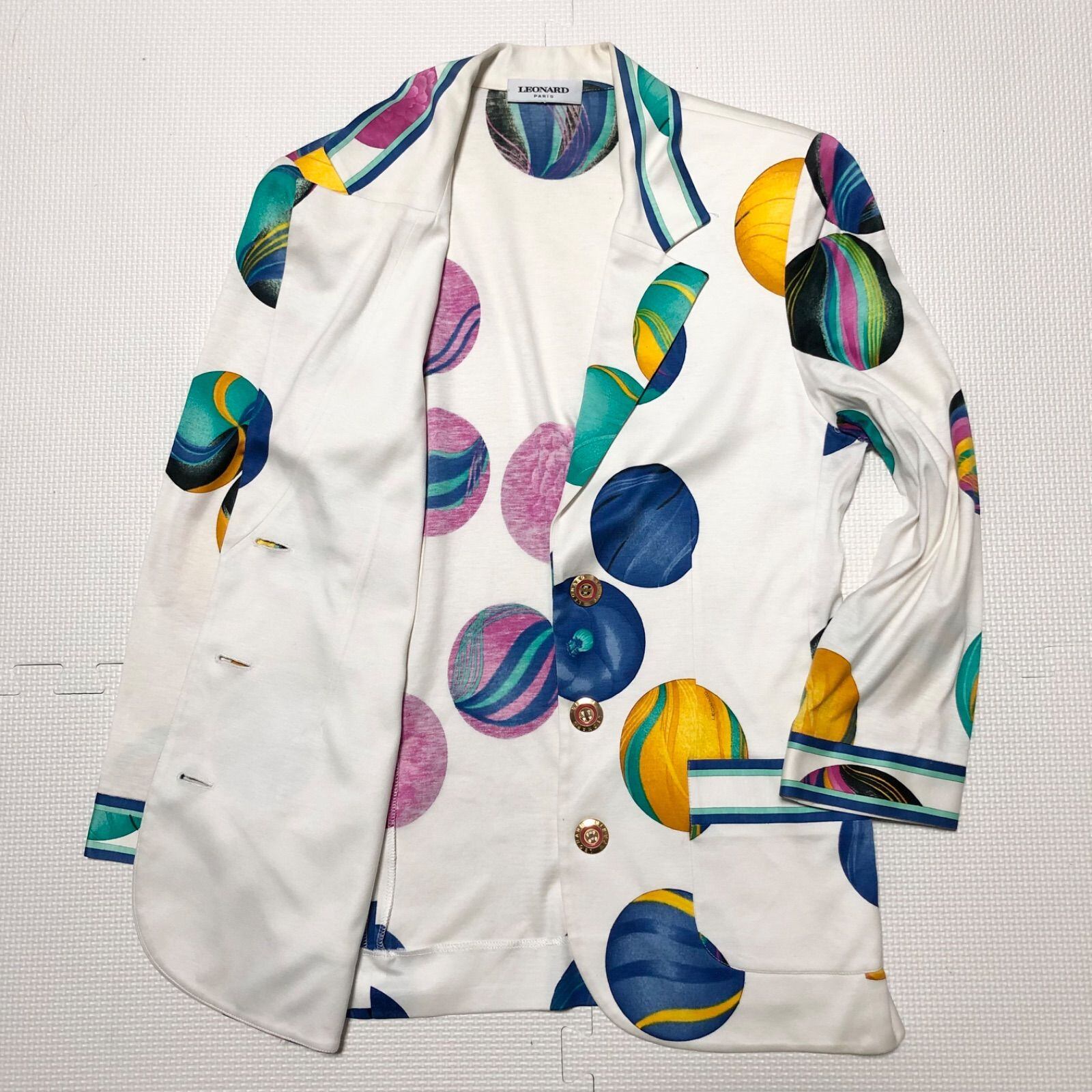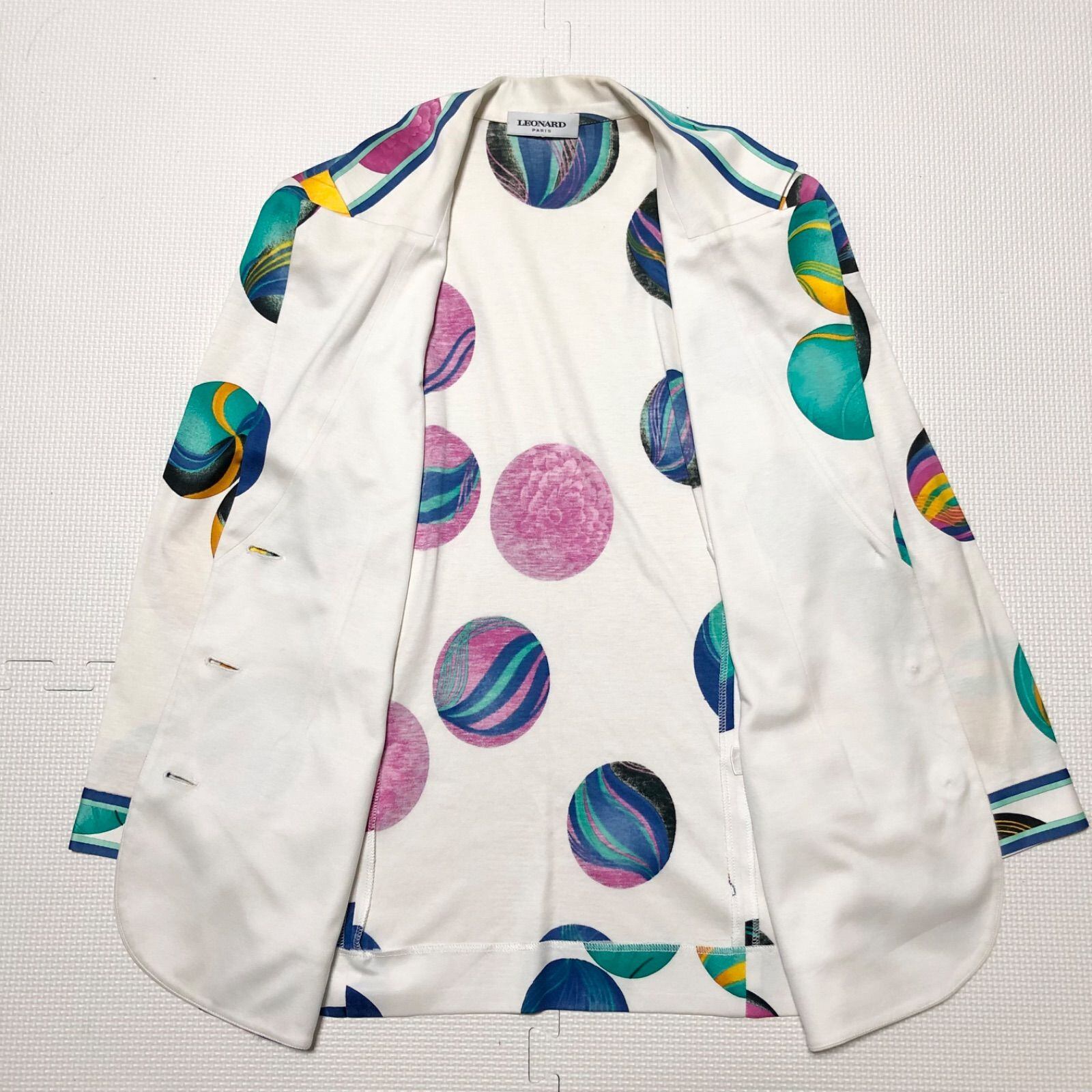 LEONARD レオナール テーラードジャケット 鞠 ボール 総柄 ロゴ金ボタン オフホワイト×マルチカラー size38(Mサイズ) シングル3つボタン 裏地なし 肩パッド レディース