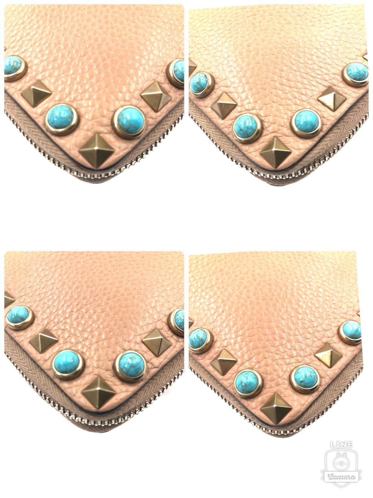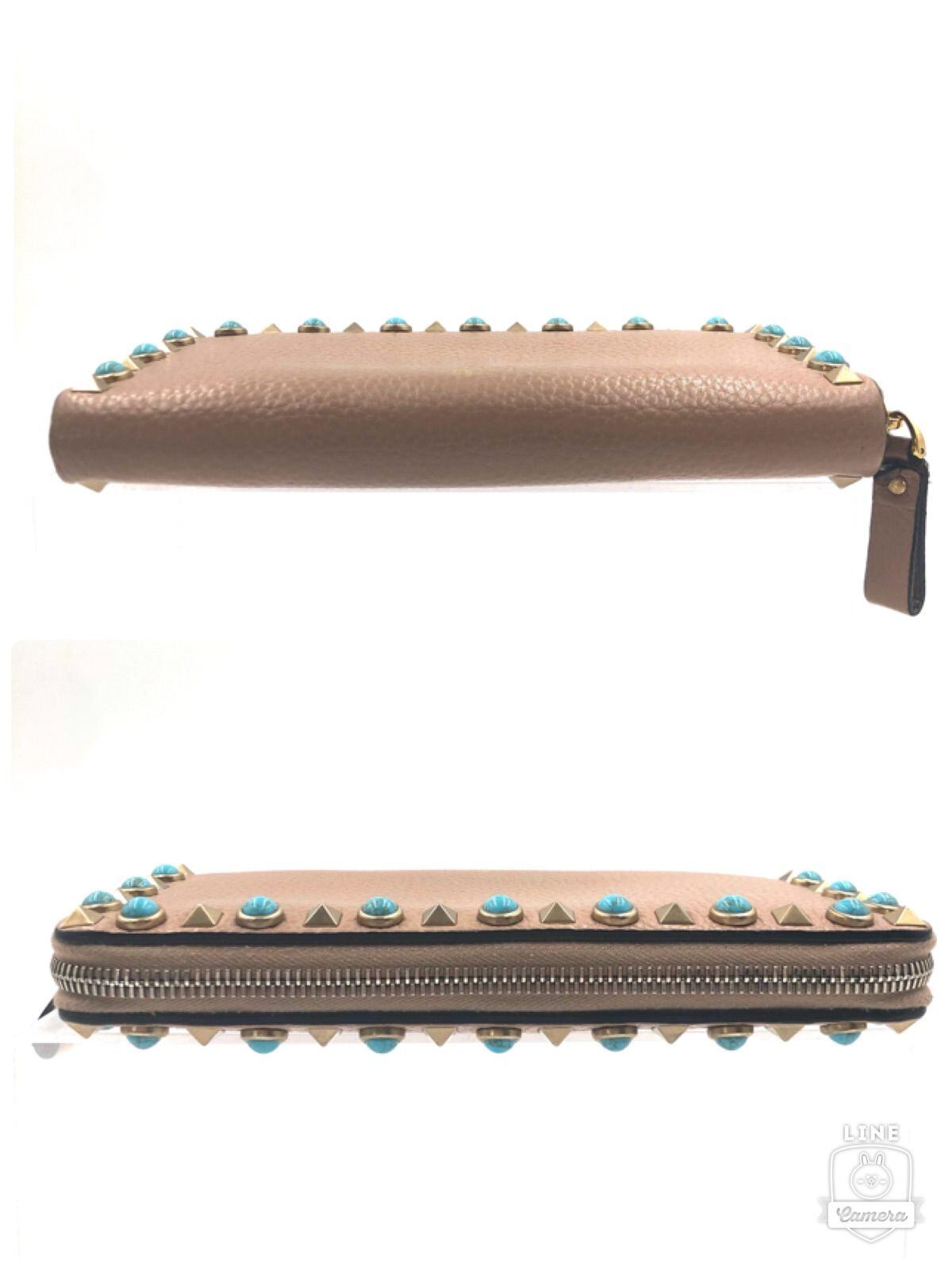 ■美品■VALENTINO GARAVANI ヴァレンティノガラヴァーニ ロックスタッズ×ターコイズ ラウンドファスナー レザー 本革 イタリア製 刻印あり ベージュ ゴールド金具