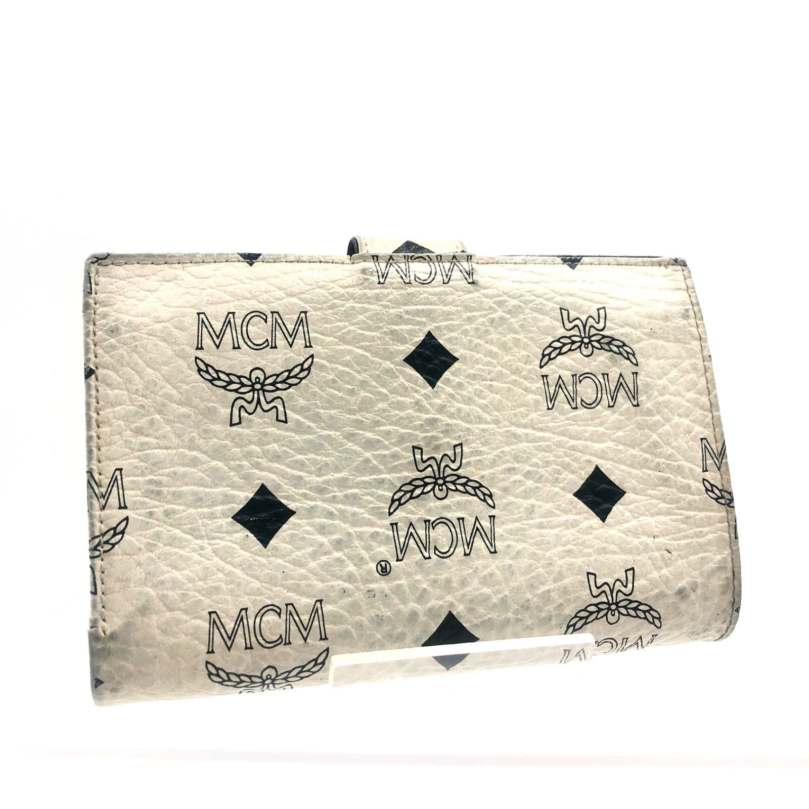 ■ドイツ時代ヴィンテージ■MCM エムシーエム ヴィセトス総柄 二つ折り財布 多機能 パスケース レザー 本革 ホワイト×ブラック ゴールド金具 レディース