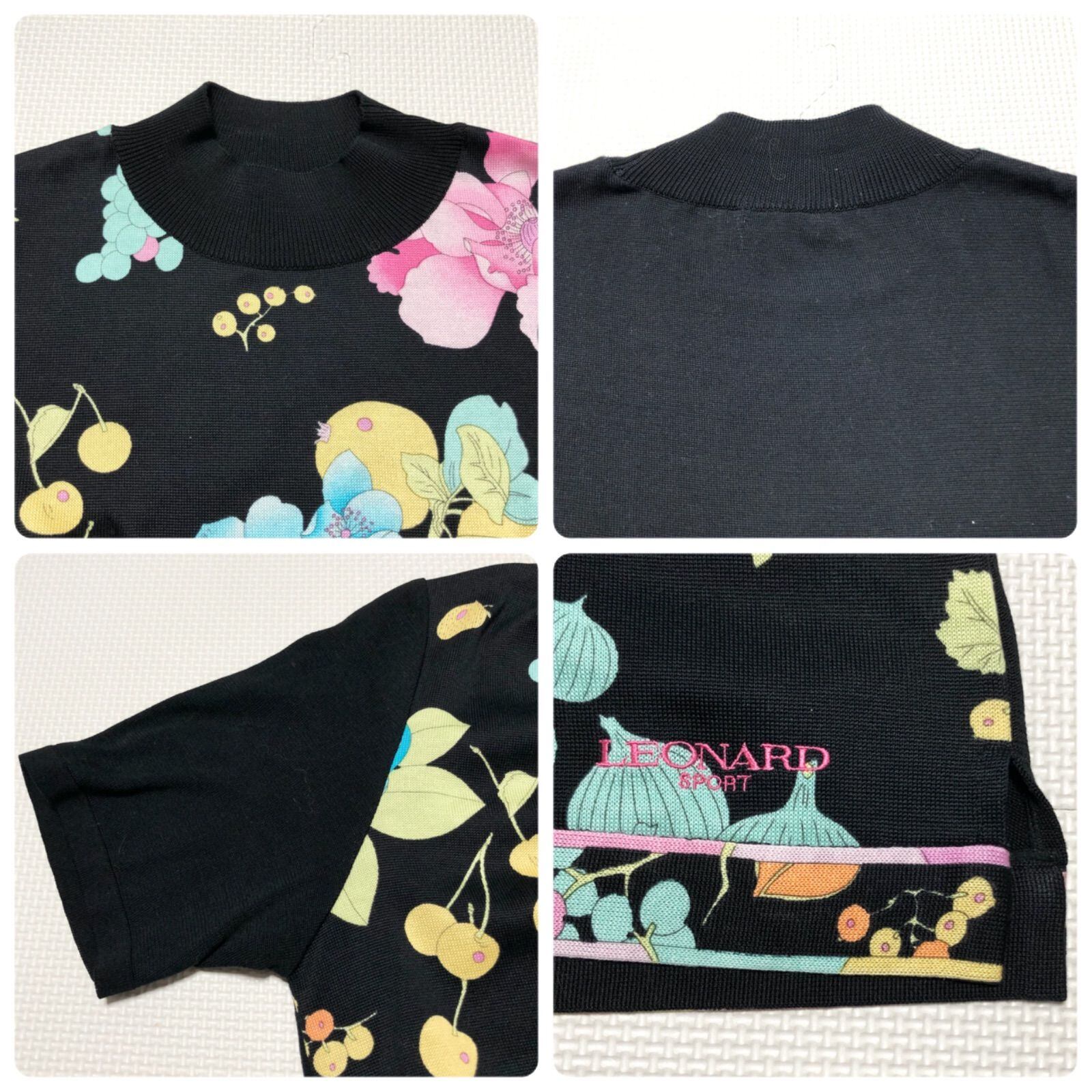 ■極美品■LEONARD SPORT レオナールスポーツ 半袖ニット ハイネック 花柄 size40(L) 日本製 ブラック×マルチカラー コットン100% レディース