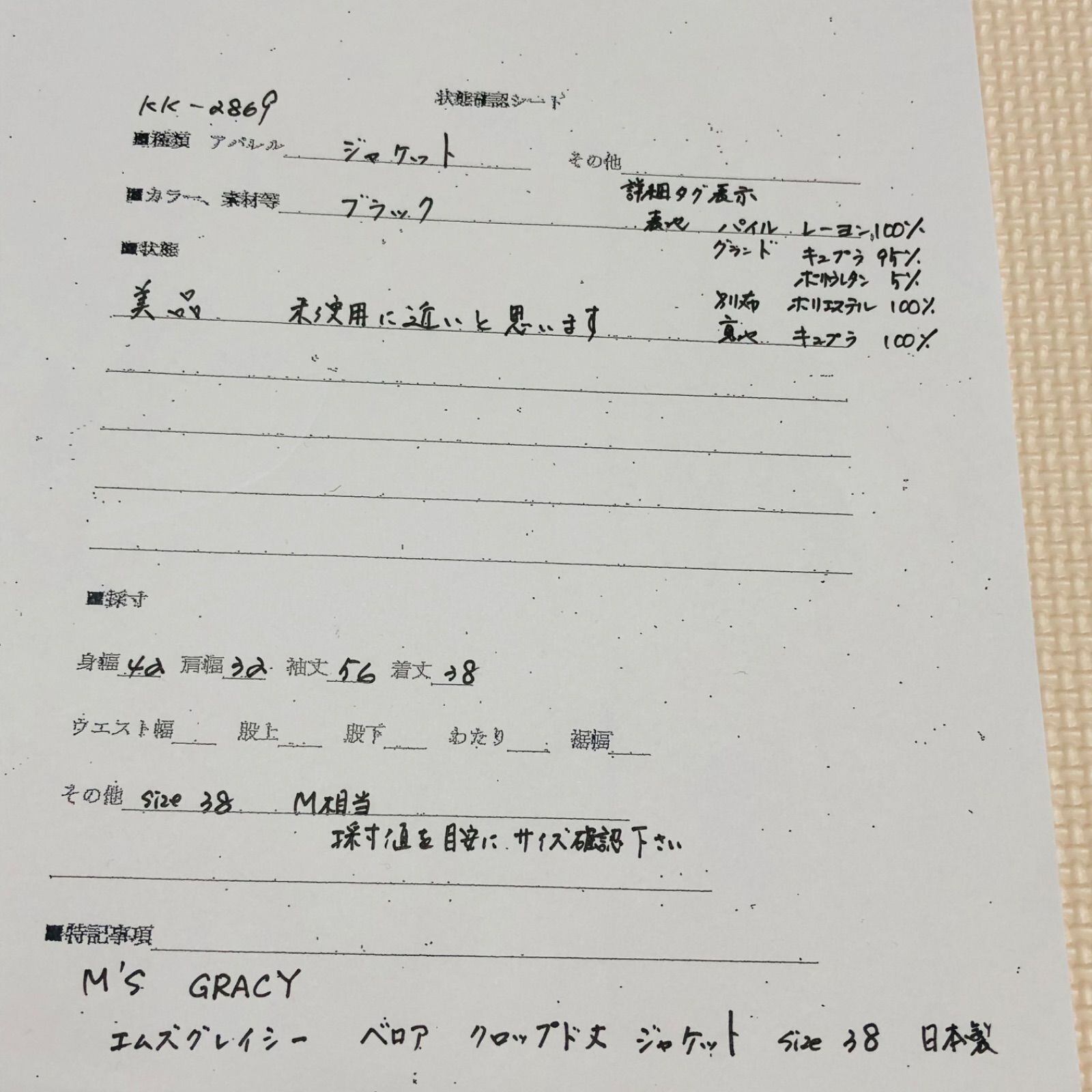 size38(サイズM相当) ※詳細は下部寸法値を必ずご確認ください