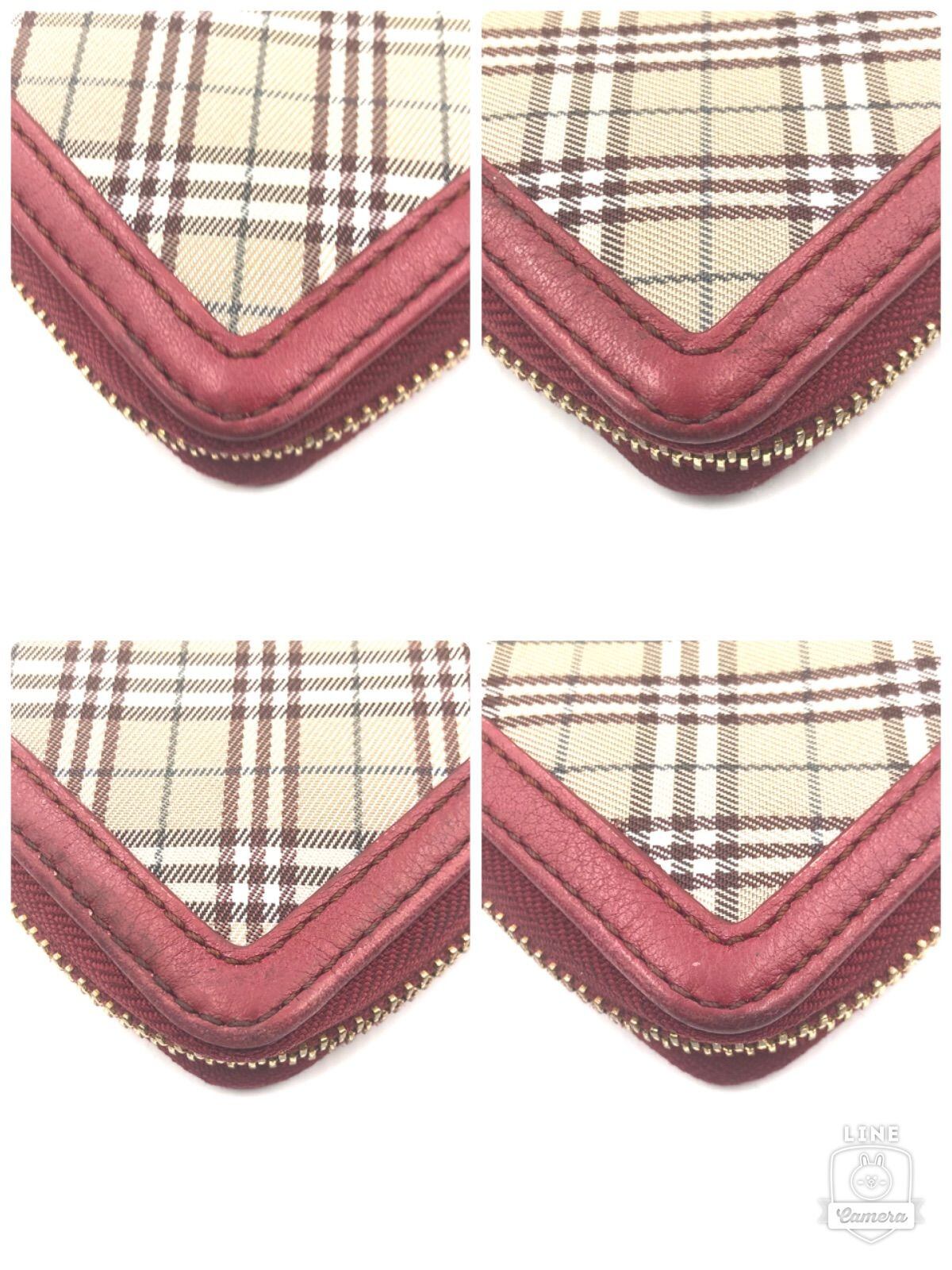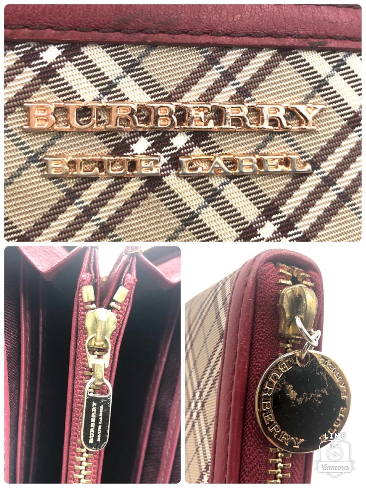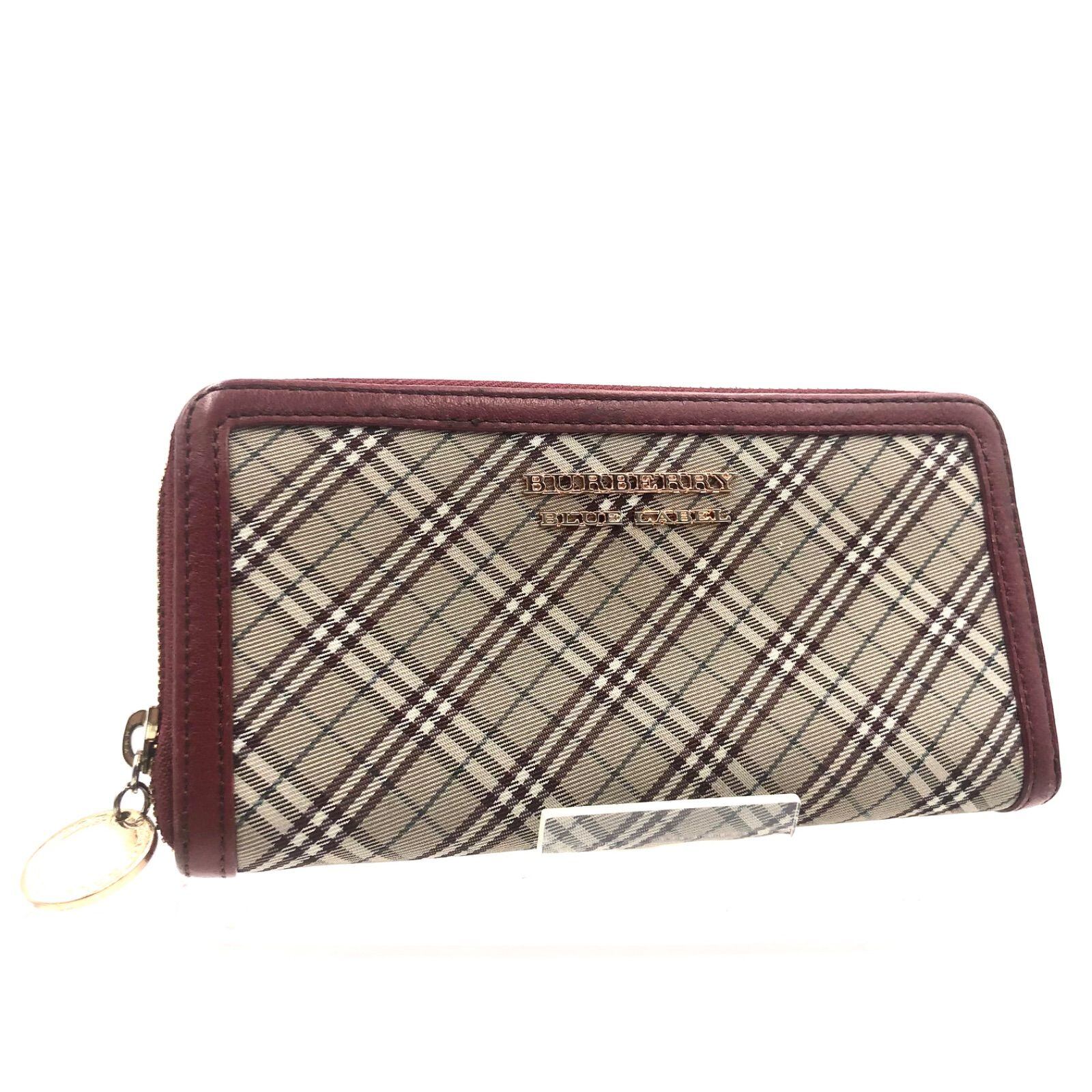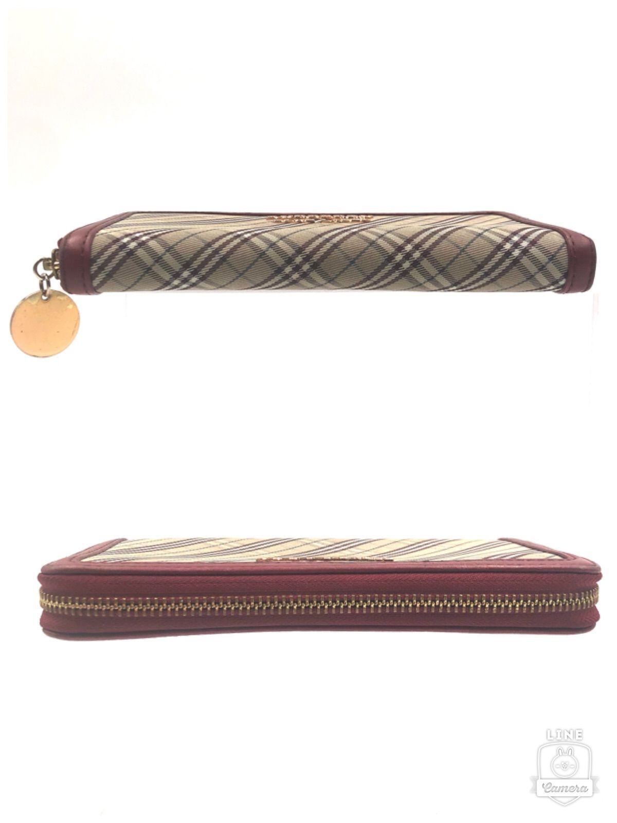 ■美品■BURBERRY BLUE LABEL バーバリーブルーレーベル ラウンドファスナー ブルーレーベルチェック ノバチェック キャンバス×レザー ロゴ金具 ベージュ×ボルドー ゴールド金具