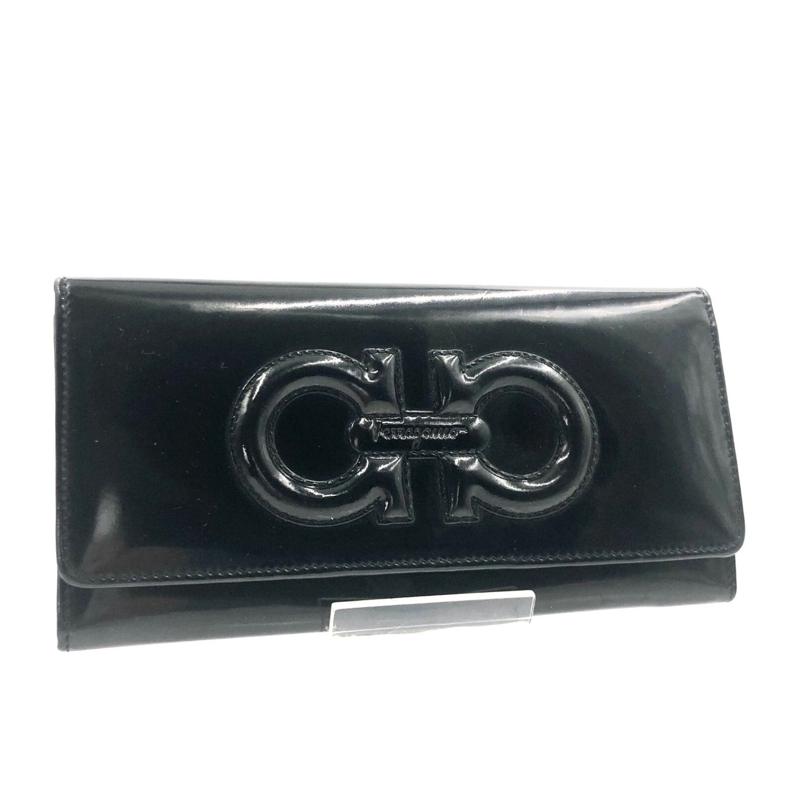 ■美品■Salvatore Ferragamo サルヴァトーレフェラガモ ダブルガンチーニステッチ 長財布 コーティングレザー ブラック ゴールド金具 イタリア製 刻印あり 227555