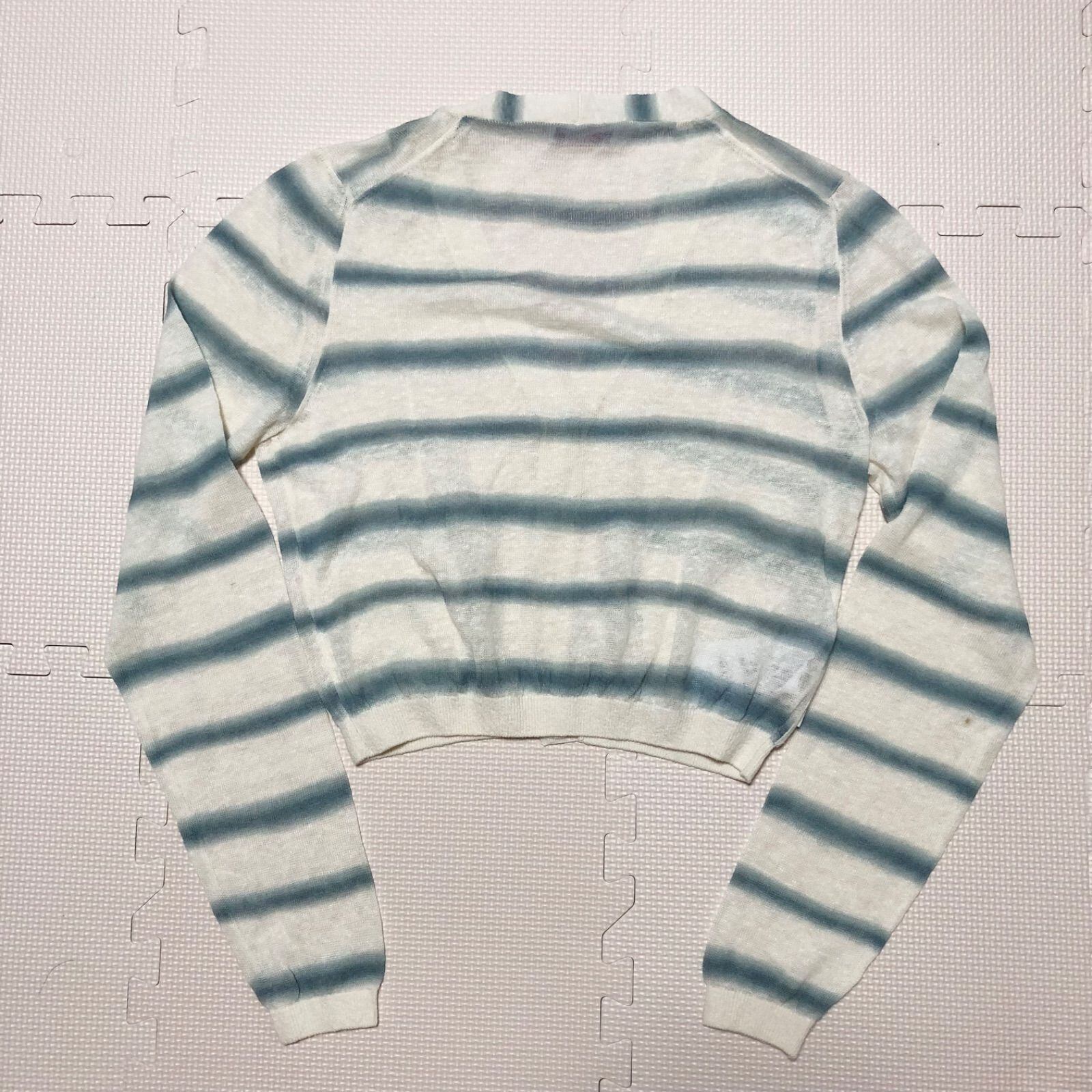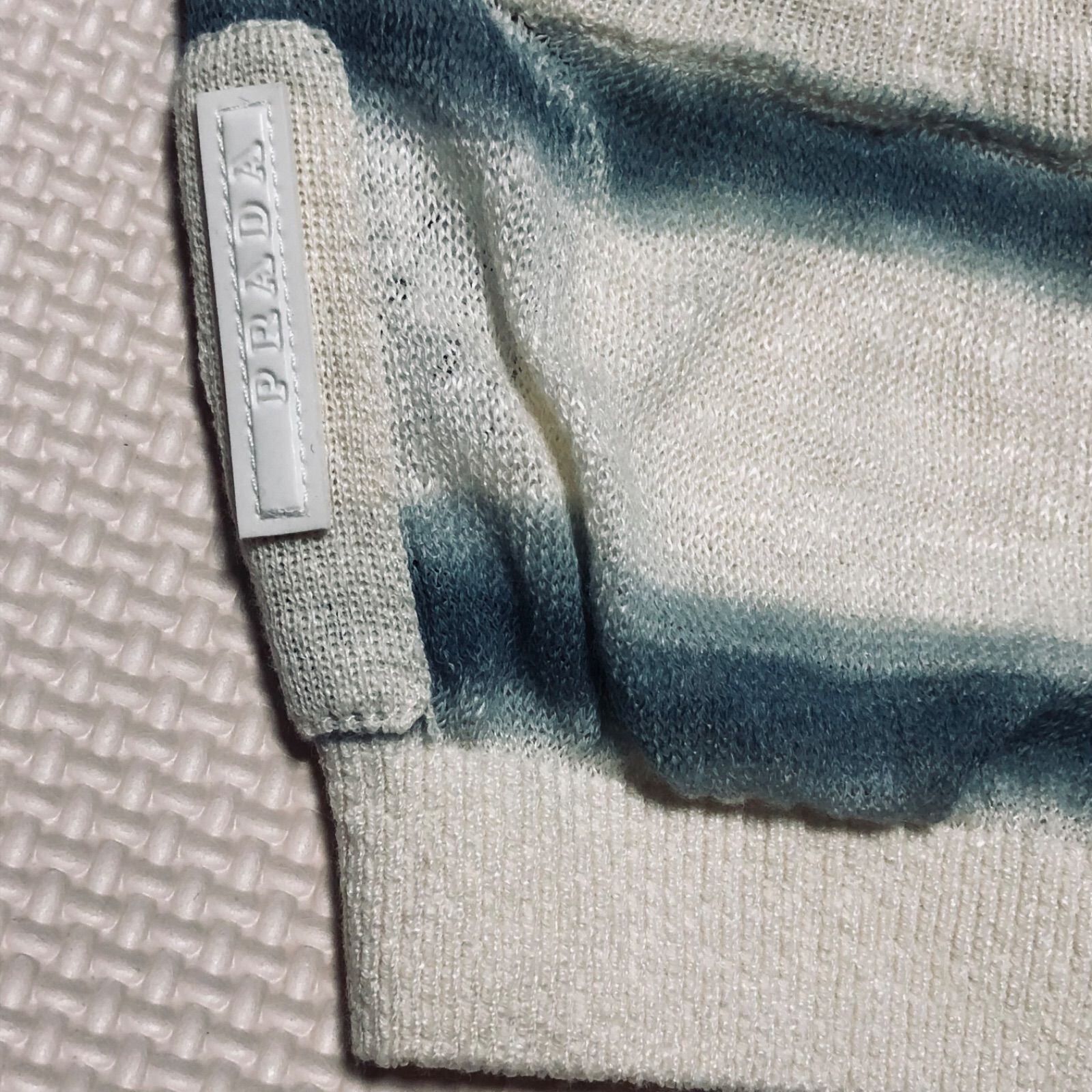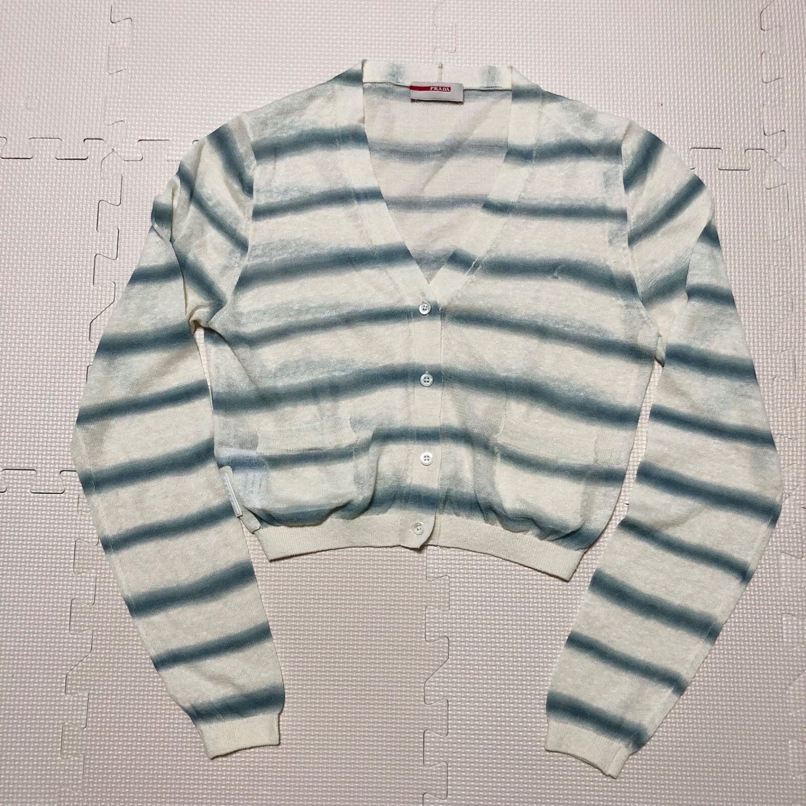 ■希少廃盤■リネン使用■PRADA SPORT プラダスポーツ サマーニット カーディガン ショート丈 ボーダー リネン×コットン size40(サイズM相当) イタリア製 アイボリー×ブルー系