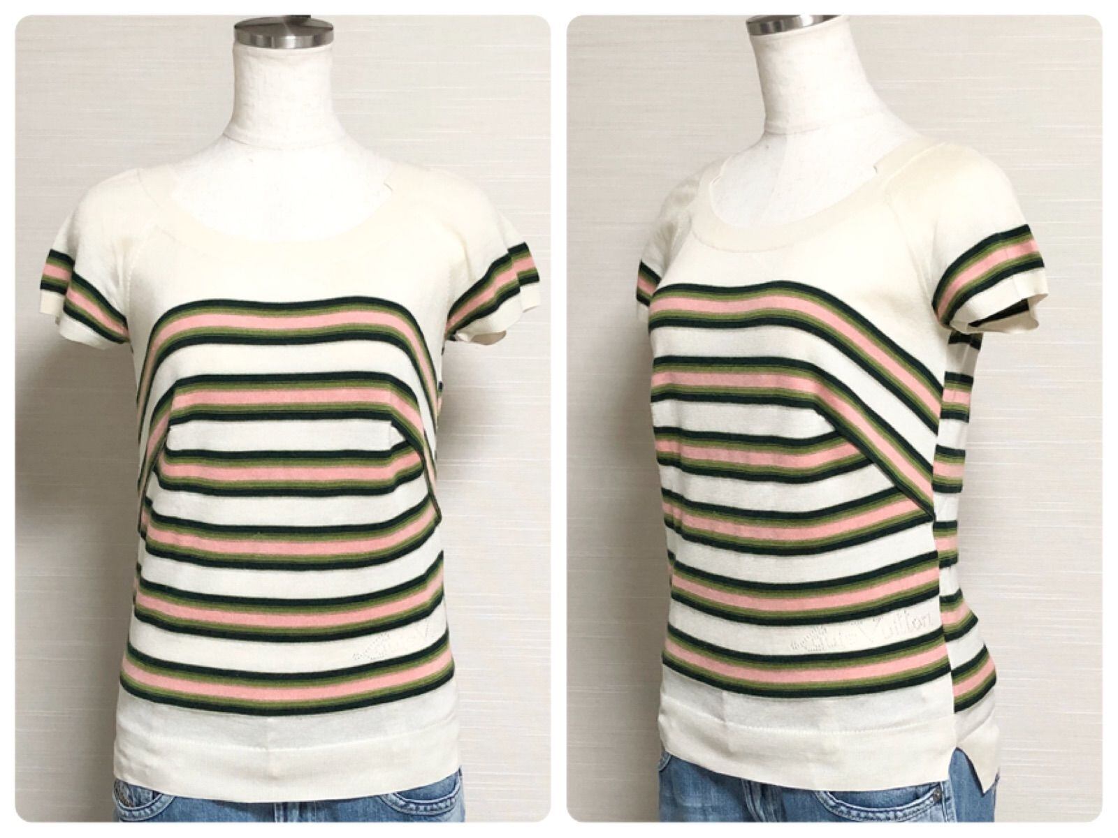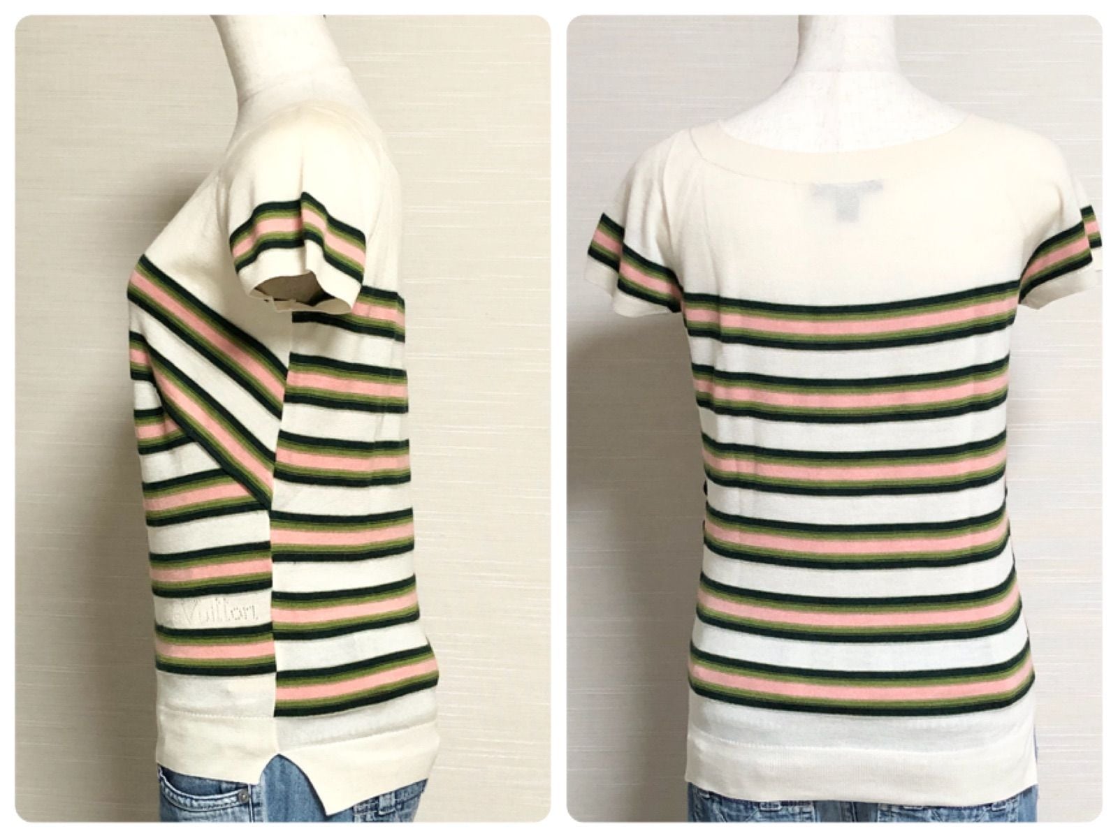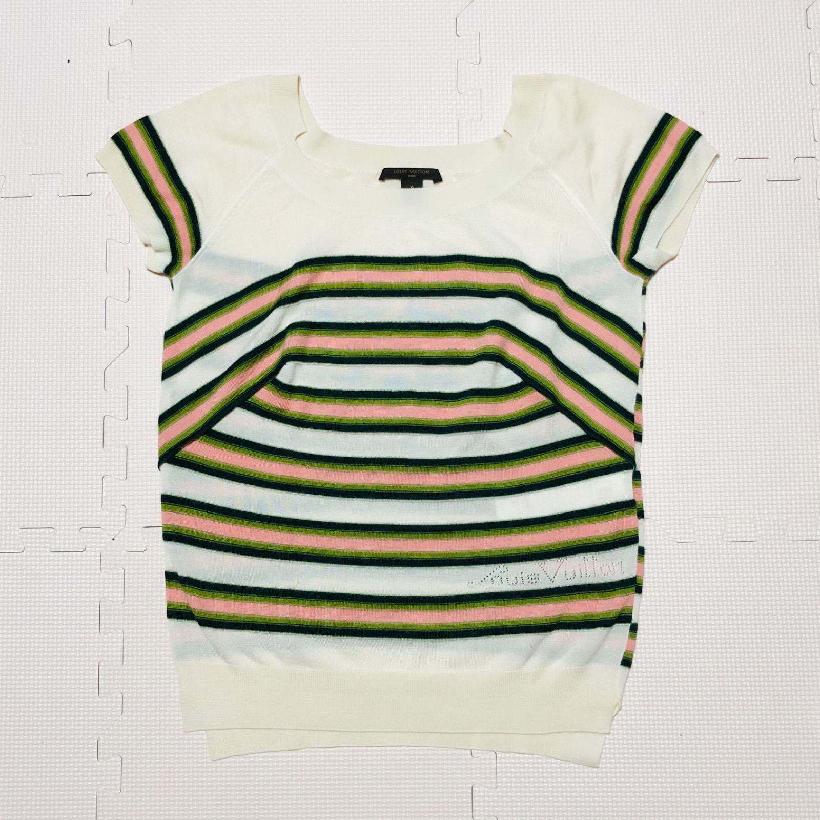 ■美品■希少カシミヤ■2011年コレクションモデル■LOUIS VUITTON ルイヴィトン サマーニット 半袖 ボーダー パンチングロゴ sizeS イタリア製 アイボリー×ピンク×グリーン シルク混カシミヤ製