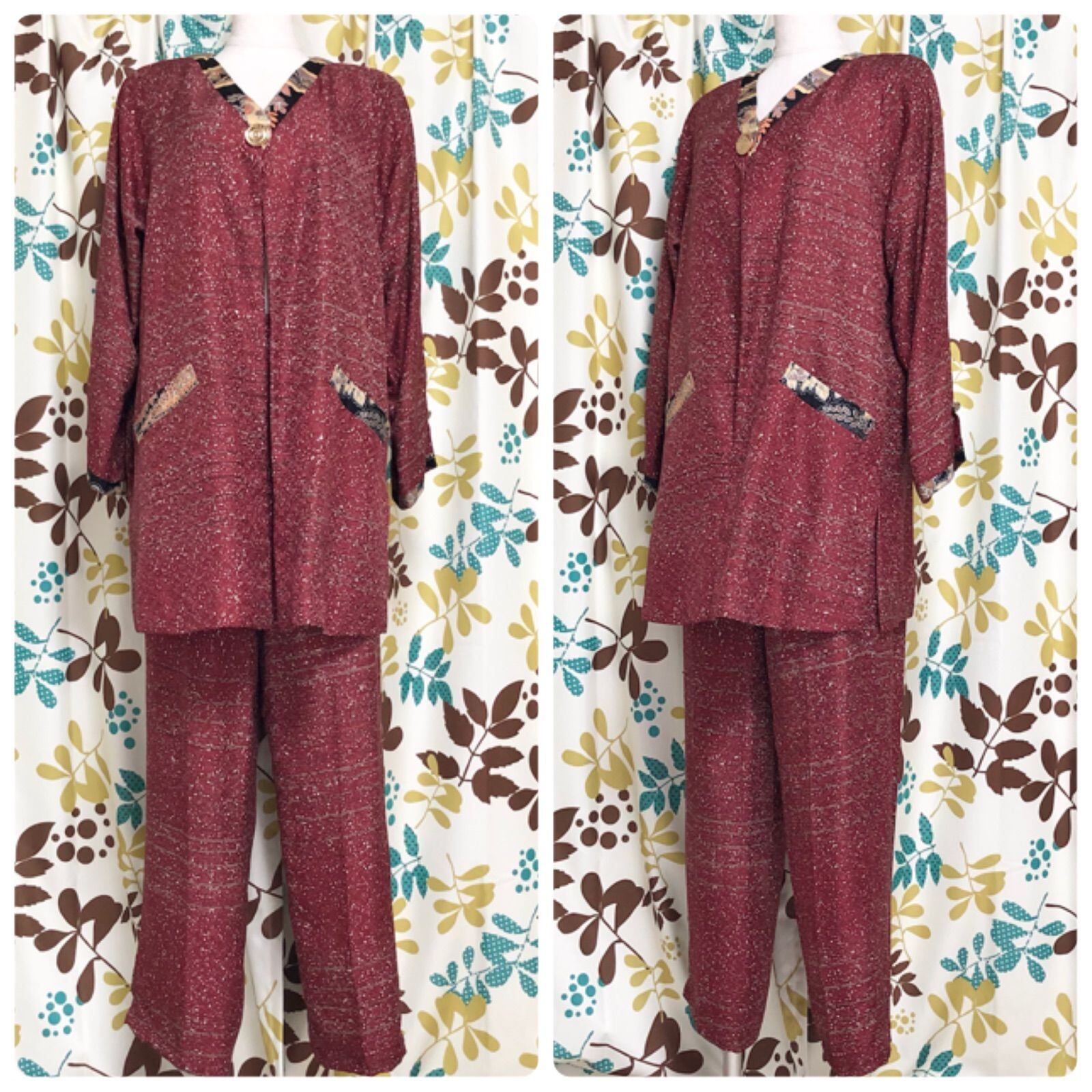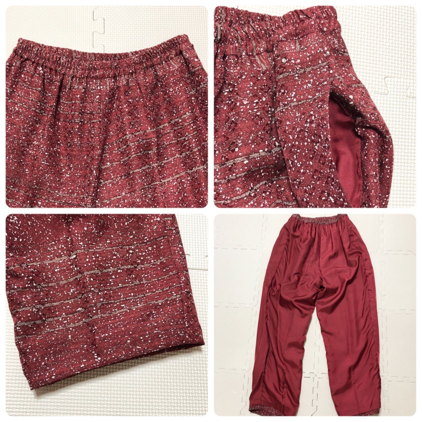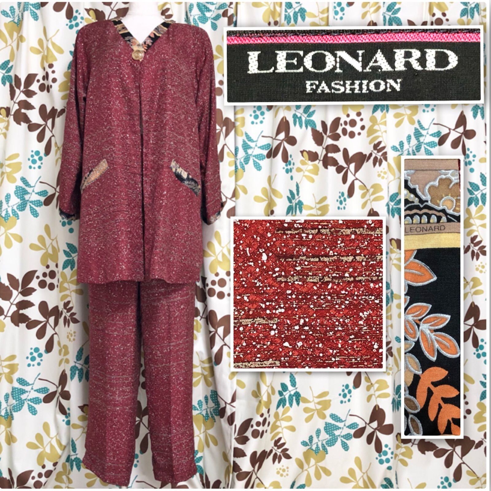 ■極美品■希少デザイン■LEONARD FASHION レオナールファッション 作務衣風セットアップ上下 和装風 花柄 金ボタン 1つボタン 光沢感 肩パッド パンツウエスト総ゴム ボルドー フリーサイズ