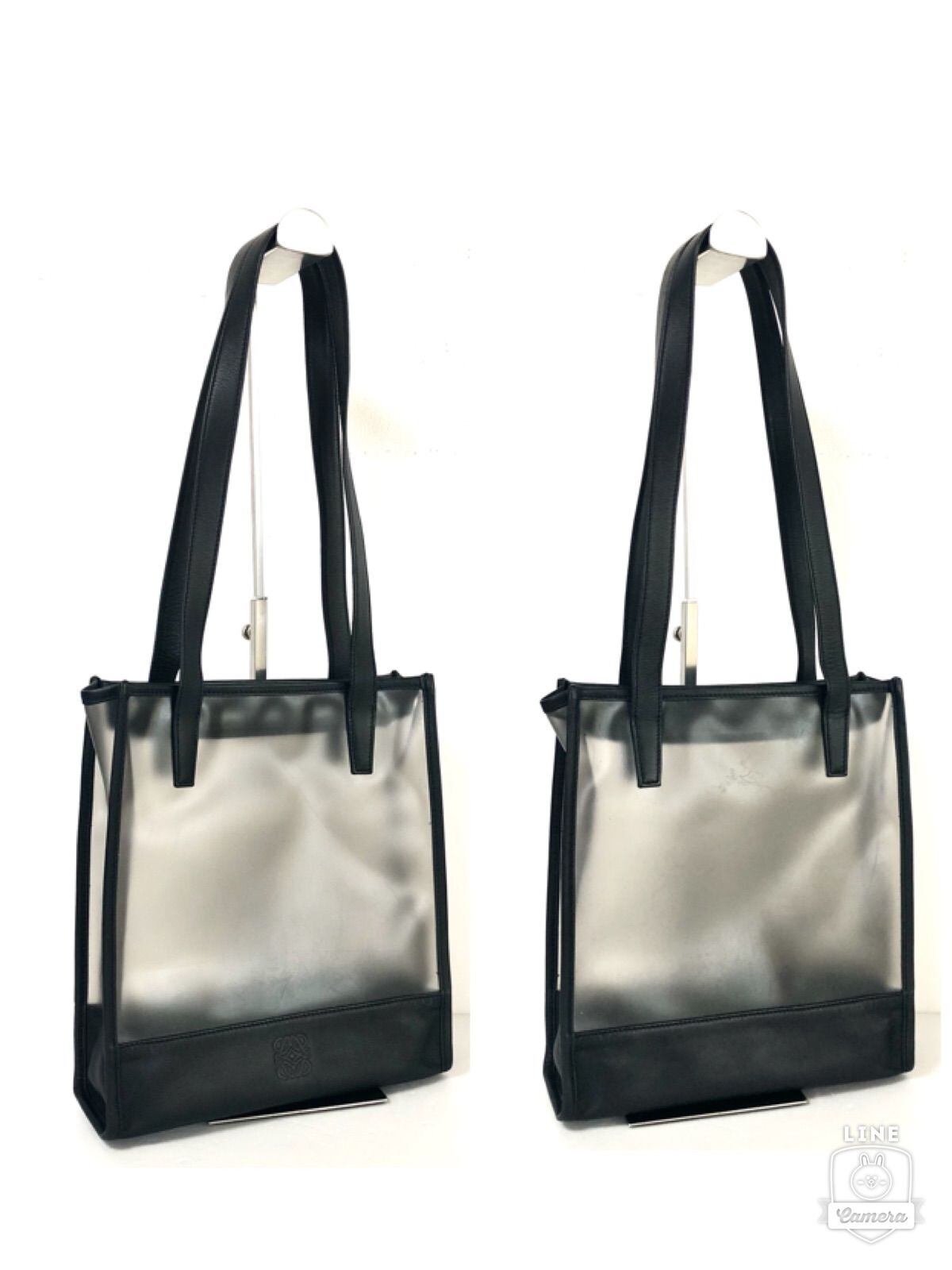 ■美品■希少■LOEWE ロエベ アナグラム型押し ビニールトートバッグ 肩がけ PVC×レザー スペイン製 ブラック 保存袋付き
