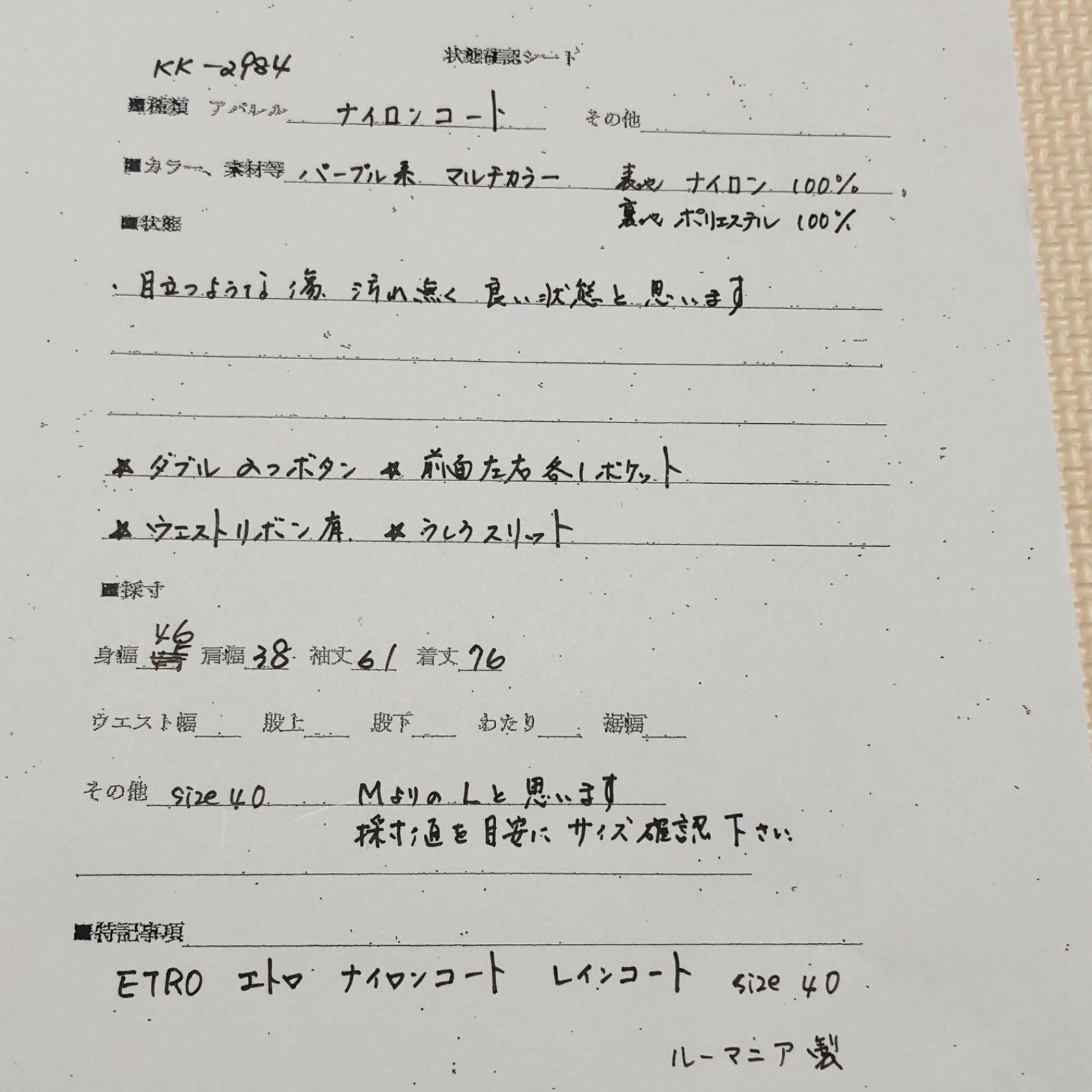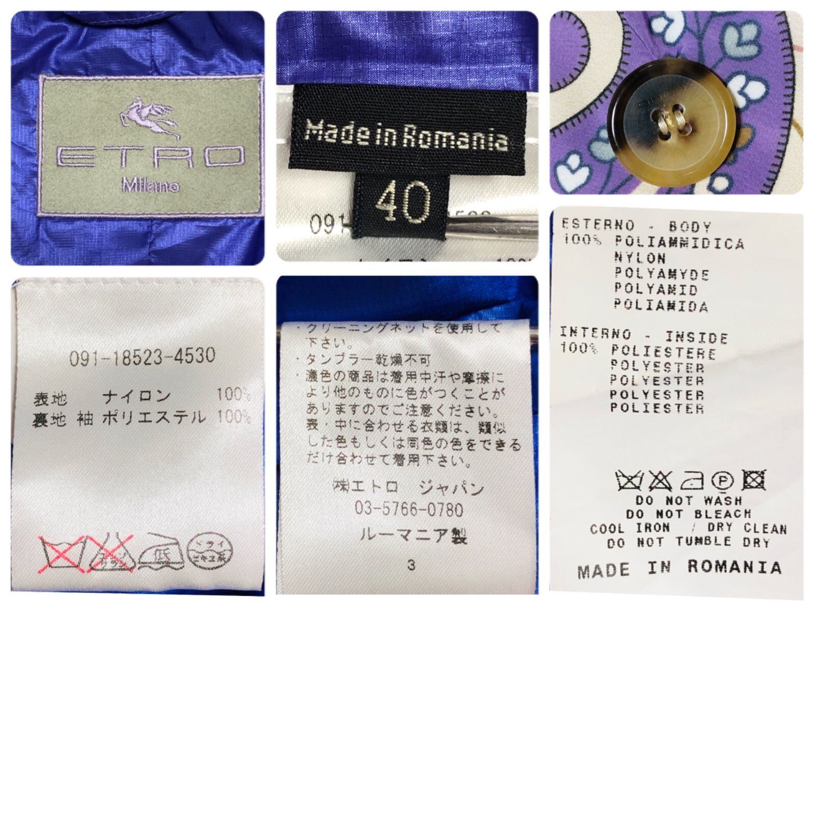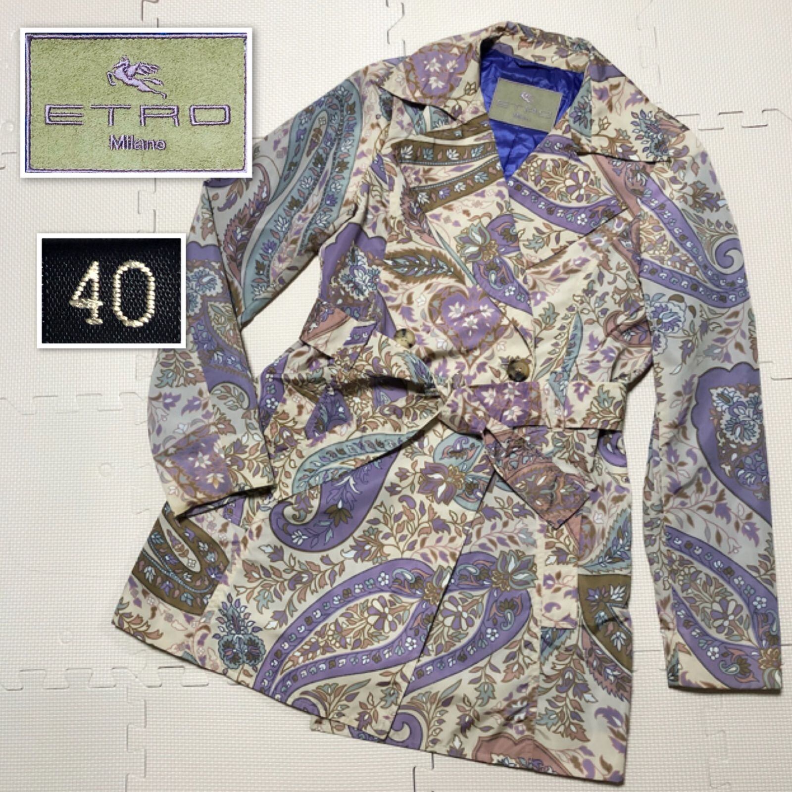 ■極美品■希少■ETRO エトロ ナイロンコート レインコート ダブルブレスト ベルト ペイズリー 花柄 ボタニカル size 40(M~L) ルーマニア製 パープル系マルチカラー レディース