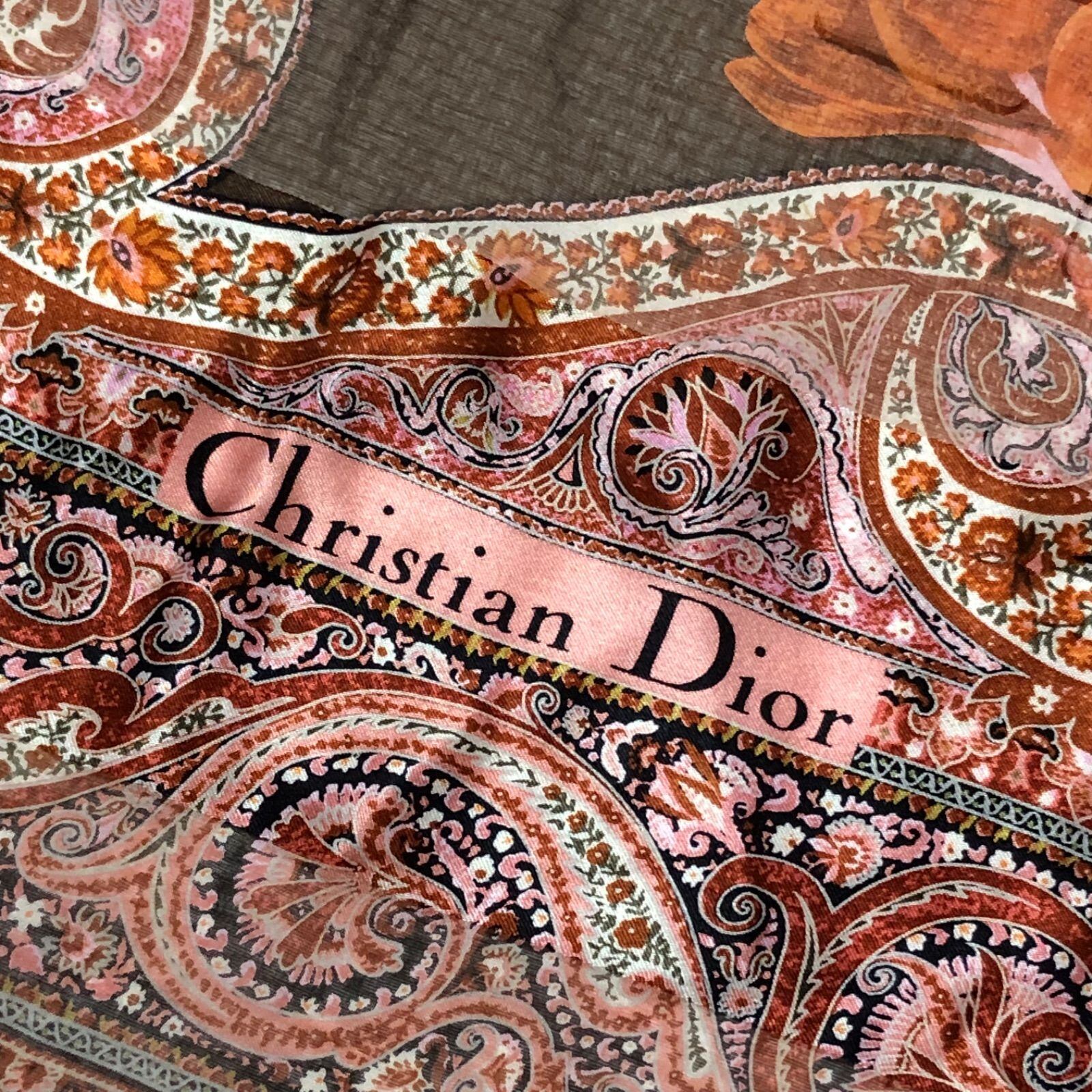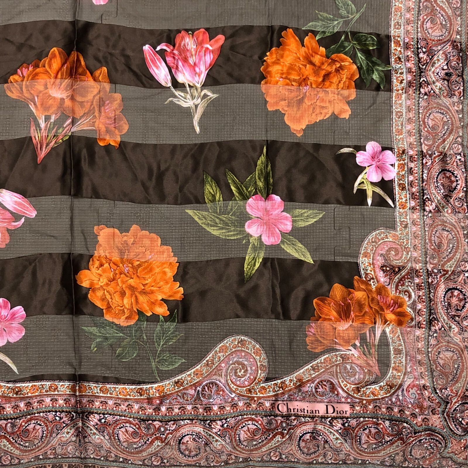 ■美品■Christian Dior クリスチャンディオール 大判スカーフ 107cm×105cm シルク100% 鐘紡製 ペイズリー ボーダー 花柄 タグあり ブラウン×マルチカラー