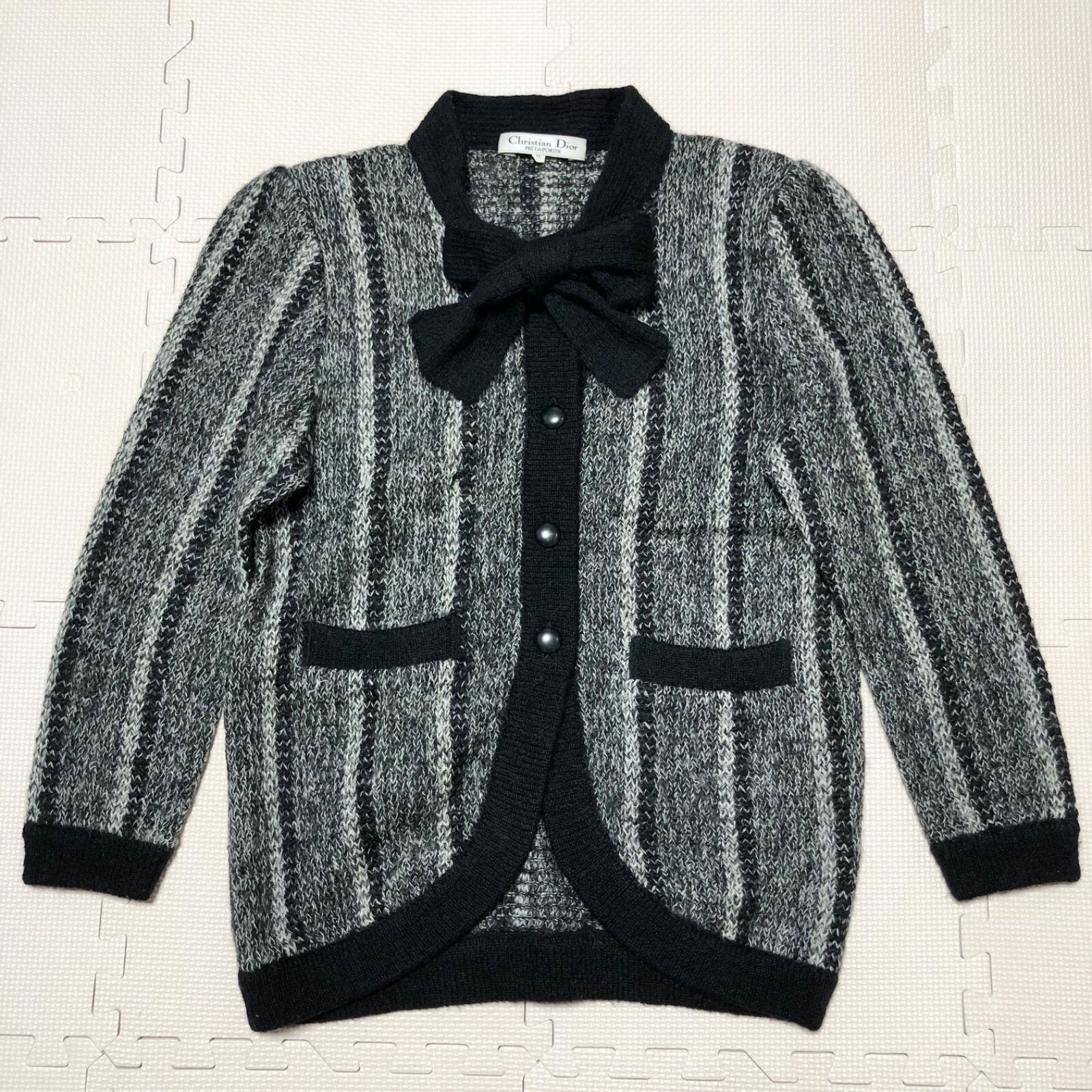 Christian Dior クリスチャンディオール ボウタイカーディガン ニット ボウタイ リボン sizeM ウール75% 肩パッド ブラック×グレー カネボウ製 レディース